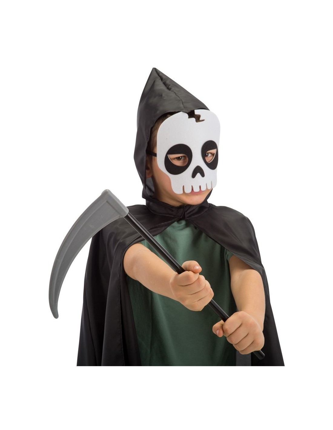 Falce scenografica perfetta per completare il tuo costume da Grim Reaper o Morte. Questo accessorio teatrale presenta una lama di circa 40 cm di lunghezza, ideale per creare un look spaventoso e d'effetto. La falce è progettata per essere maneggevole e sicura durante l'uso scenico, con impugnatura ergonomica che garantisce una presa salda. Perfetta per trasformarsi nel classico Mietitore della mitologia e del cinema horror.