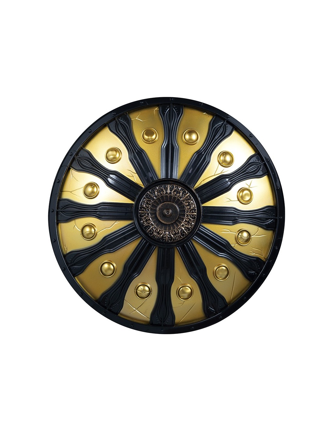 Questo magnifico scudo spartano presenta un design circolare di 45 cm di diametro con decorazioni dorate su fondo nero che richiamano l'antica tradizione guerriera della Grecia classica. Il motivo geometrico radiale con elementi dorati dona un aspetto imponente e scenografico, perfetto per completare qualsiasi costume da guerriero o gladiatore. Lo scudo è realizzato con materiali resistenti che garantiscono una buona presa e maneggevolezza durante l'uso. Questo accessorio trasformerà immediatamente il tuo look in quello di un valoroso combattente dell'antichità.