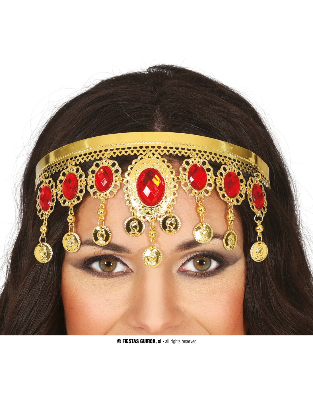Questa splendida diadema orientale in metallo dorato è caratterizzata da eleganti pietre rosse incastonate e decorative monete pendenti che creano un effetto scenografico unico. Il design richiama lo stile delle antiche principesse orientali e delle danzatrici del ventre, con dettagli intricati che includono catenelle dorate e pendagli che si muovono delicatamente. La fascia si adatta comodamente alla testa grazie alla sua struttura flessibile, mentre le pietre rosse brillanti catturano la luce creando riflessi affascinanti.