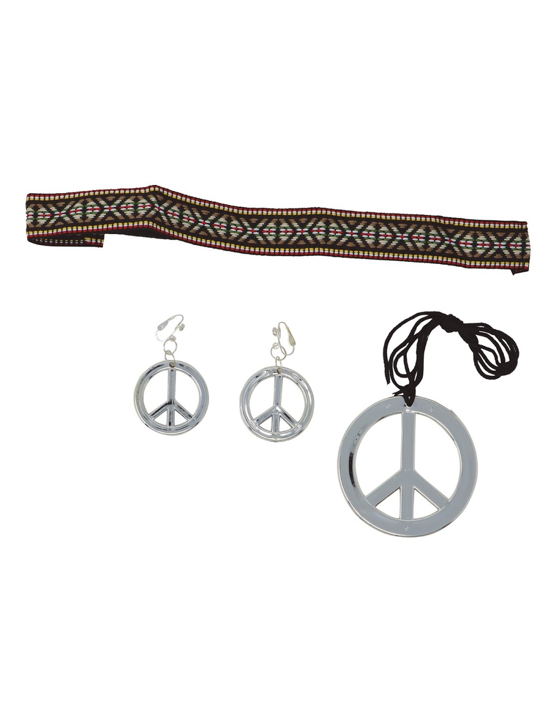 Completa il tuo look hippie con questo fantastico set di accessori che include fascia per capelli decorata, collana con simbolo della pace e orecchini pendenti con piume. Il set comprende tutti gli elementi essenziali per trasformarti in una vera flower power degli anni '70. La fascia elastica si adatta comodamente alla testa, mentre la collana con cordino nero mette in risalto l'iconico simbolo peace and love. Gli orecchini con piume aggiungono il tocco finale al look bohémien.