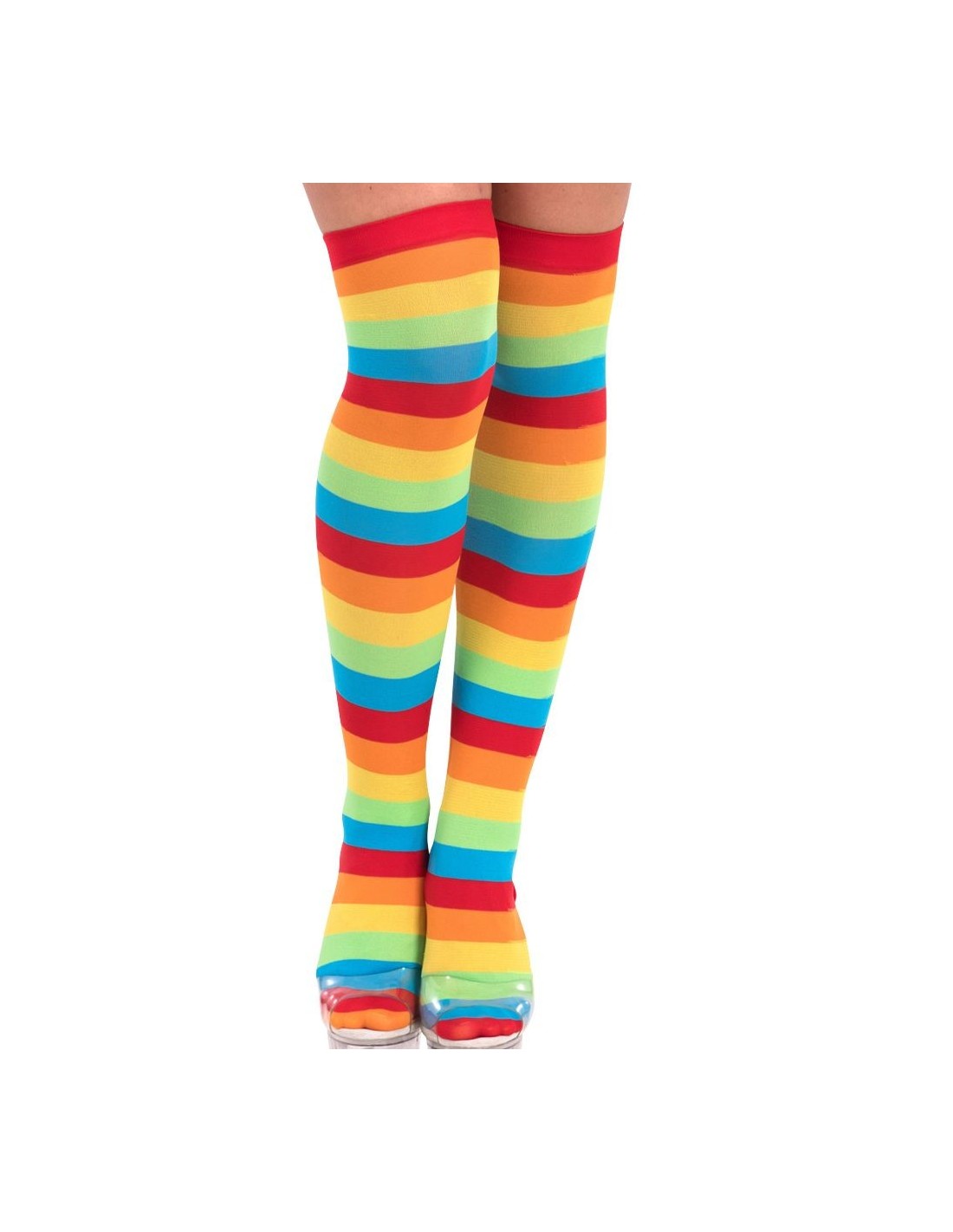 Le calze a righe multicolore sono l'accessorio perfetto per completare il tuo look da festa o costume. Caratterizzate da vivaci strisce orizzontali nei colori dell'arcobaleno - rosso, arancione, giallo, verde e blu - queste calze lunghe arrivano fino al ginocchio e si adattano comodamente alla gamba. Realizzate in morbido tessuto elasticizzato, garantiscono una vestibilità comoda per tutta la durata dell'evento. Il set comprende un paio di calze a righe colorate.