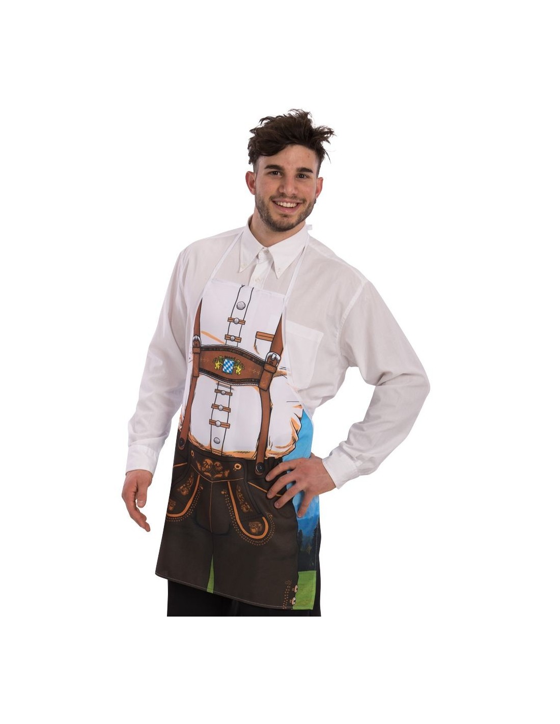 Il grembiule bavarese da uomo è l'accessorio perfetto per trasformarsi in un autentico bavarese durante le feste a tema. Questo pratico grembiule riproduce fedelmente i tradizionali lederhosen con bretelle e decorazioni tipiche, creando un look divertente e caratteristico. Realizzato con stampa dettagliata che simula pelle e tessuto, si indossa facilmente sopra i propri abiti. L'accessorio è comodo da portare e garantisce un effetto scenico immediato per ogni occasione festiva.