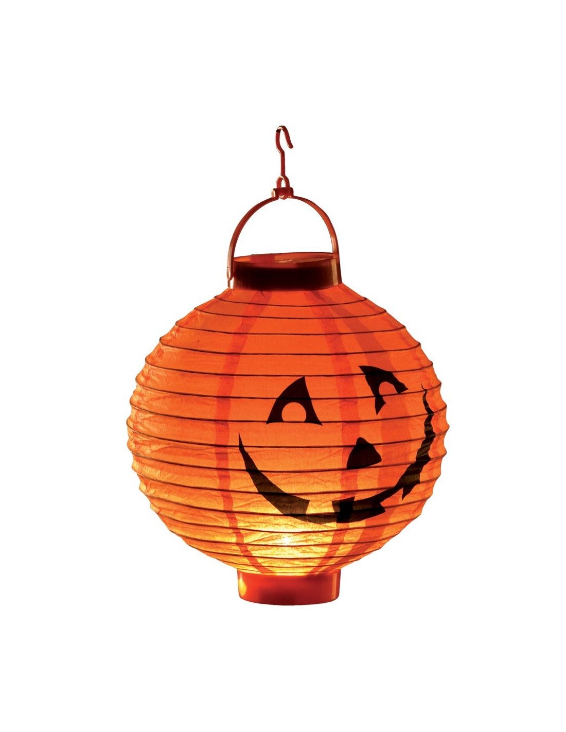 Questa lanterna decorativa a forma di zucca porta l'atmosfera di Halloween direttamente nella tua casa o festa. Con un diametro di circa 20 cm, presenta il classico volto sorridente intagliato della jack-o'-lantern su sfondo arancione acceso. La struttura pieghevole in carta permette di riporla facilmente dopo l'uso, mentre il sistema di illuminazione interno crea suggestivi giochi di luce e ombra. Il pratico gancio superiore consente di appenderla ovunque desideri. Le batterie non sono incluse nel set.