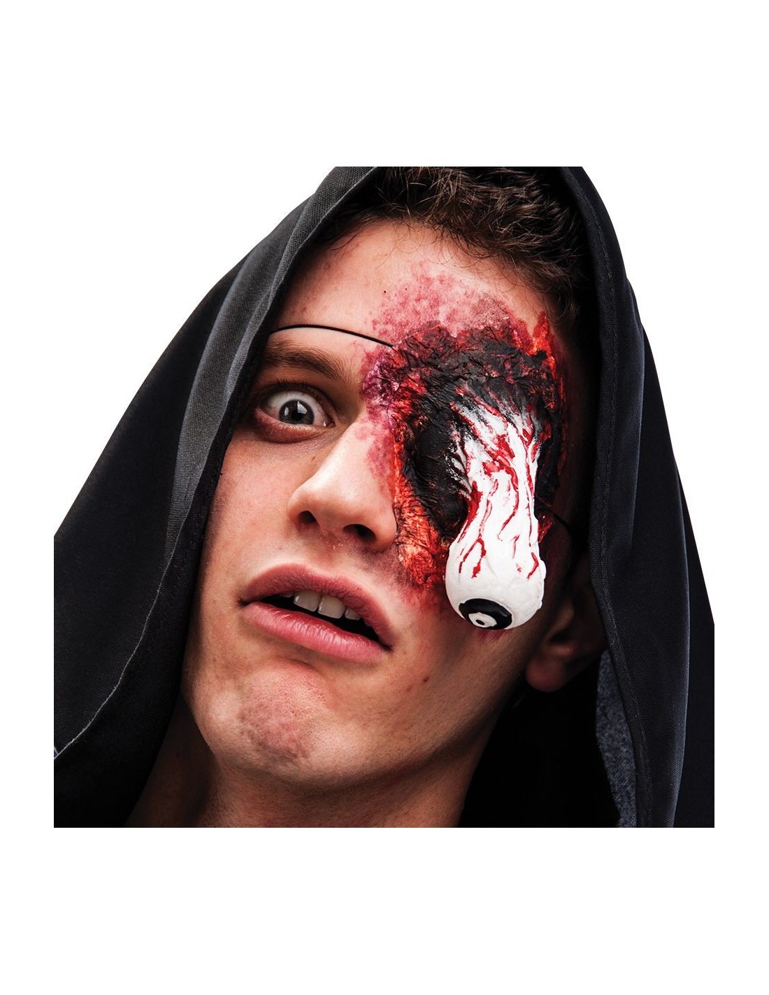 Terrificante cicatrice con benda sull'occhio pendente per un look horror davvero spaventoso. Questo accessorio presenta una ferita realistica con effetti di sangue finto che simula un grave trauma oculare, completata da una benda che pende dall'occhio danneggiato. L'applicazione è semplice e sicura sulla pelle, garantendo un effetto shock immediato. Perfetto per chi vuole un travestimento horror che lasci tutti senza parole durante le feste in costume.