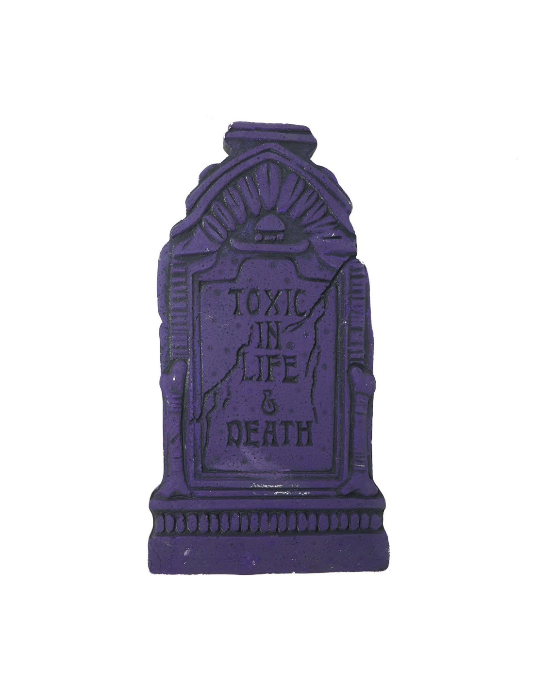 Questa lapide decorativa in plastica viola presenta una scritta inquietante "Toxic in Life & Death" perfetta per creare un'atmosfera da brivido. La decorazione presenta dettagli scolpiti che riproducono una vera pietra tombale con elementi gotici e bordi sagomati. Realizzata in materiale plastico resistente, può essere utilizzata sia per interni che esterni. Ideale come elemento scenografico per trasformare qualsiasi ambiente in un cimitero spettrale.