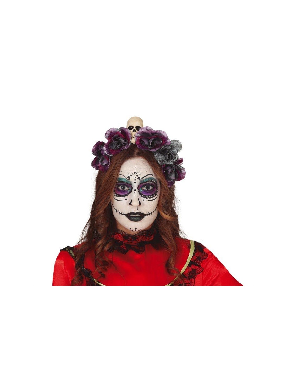 Questo diadema gotico con fiori grigi e teschio è l'accessorio perfetto per un look Day of the Dead di grande impatto. Il cerchietto è decorato con rose e fiori artificiali nei toni del grigio e viola scuro, arricchito da un piccolo teschio centrale che dona un tocco macabro ed elegante. I fiori in tessuto sono finemente dettagliati e creano un contrasto suggestivo con l'elemento horror. L'accessorio si indossa comodamente come un normale cerchietto per capelli ed è realizzato con materiali resistenti che mantengono la forma durante tutta la serata.