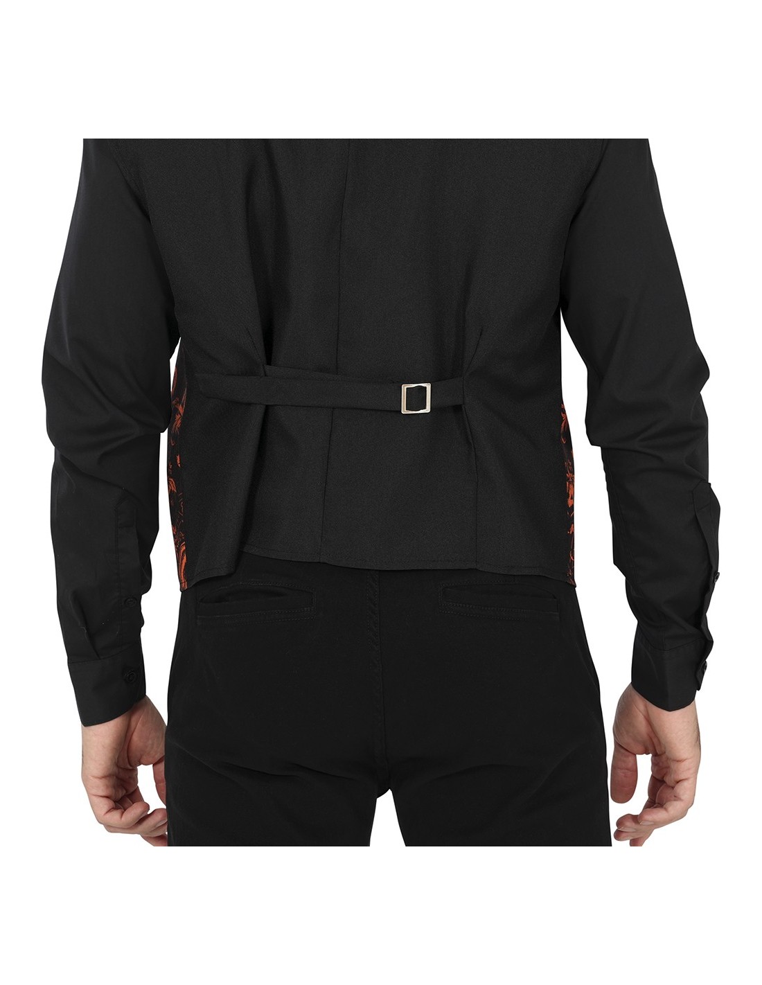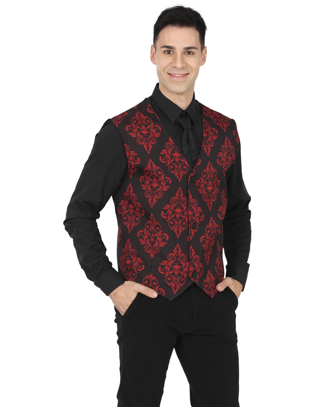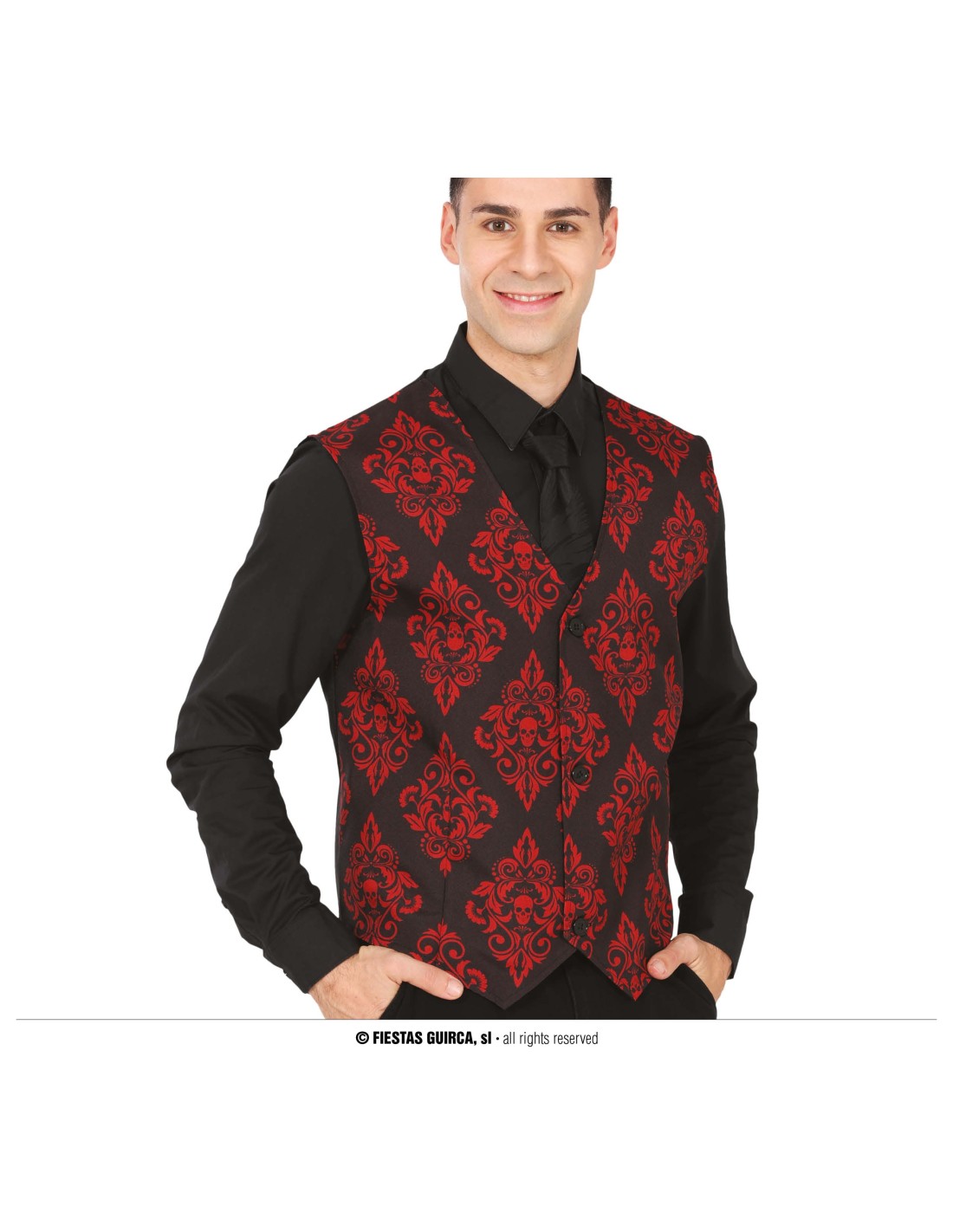 Il Gilet Vampiro presenta un elegante tessuto damascato rosso con motivi ornamentali su base nera, perfetto per completare il tuo look da creatura della notte. Questo accessorio indispensabile si caratterizza per il taglio classico e i dettagli decorativi che richiamano l'atmosfera gotica vittoriana. Il gilet si abbina perfettamente a camicia nera, pantaloni scuri e mantello per creare un costume da vampiro completo e affascinante. La fantasia damascata dona un tocco aristocratico e misterioso, essenziale per incarnare il perfetto signore delle tenebre.