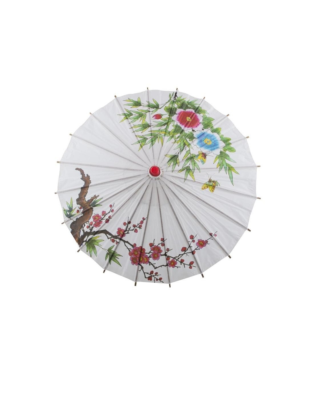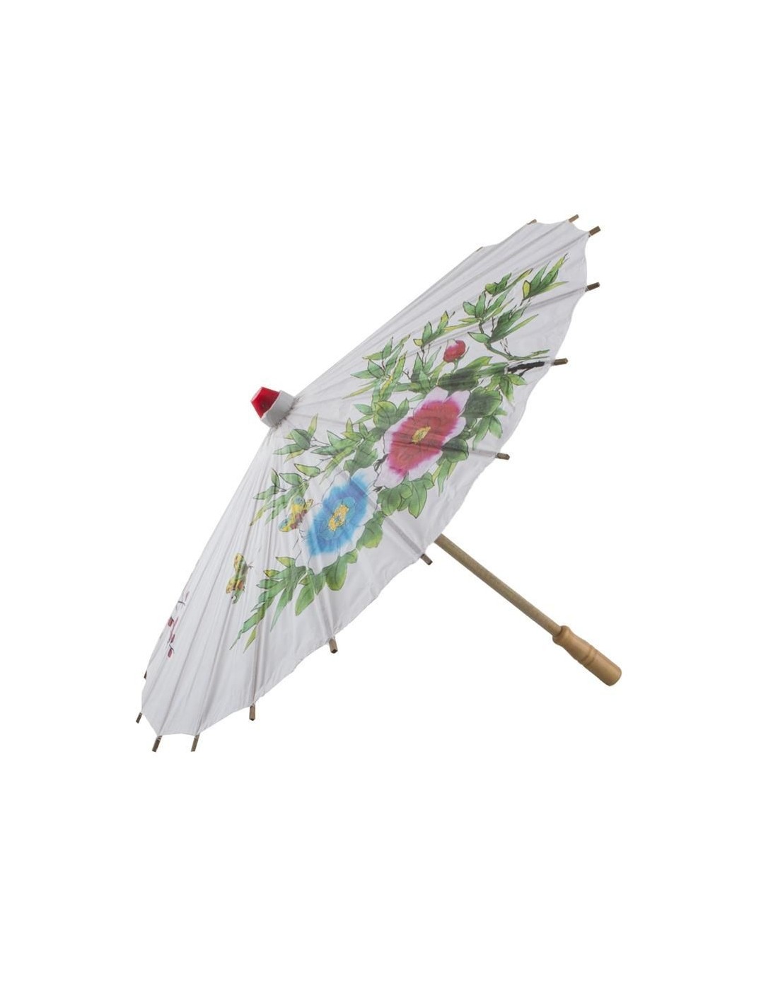 Questo elegante ombrello cinese in carta è decorato con splendidi motivi floreali che richiamano la tradizione orientale. Realizzato in carta resistente con struttura in legno, presenta delicati fiori rosa e blu dipinti a mano su fondo bianco, creando un accessorio raffinato e scenografico. L'ombrello è dotato di manico in bambù naturale e struttura pieghevole tradizionale. Perfetto per completare costumi orientali, geisha, kimono o look ispirati alla cultura asiatica.