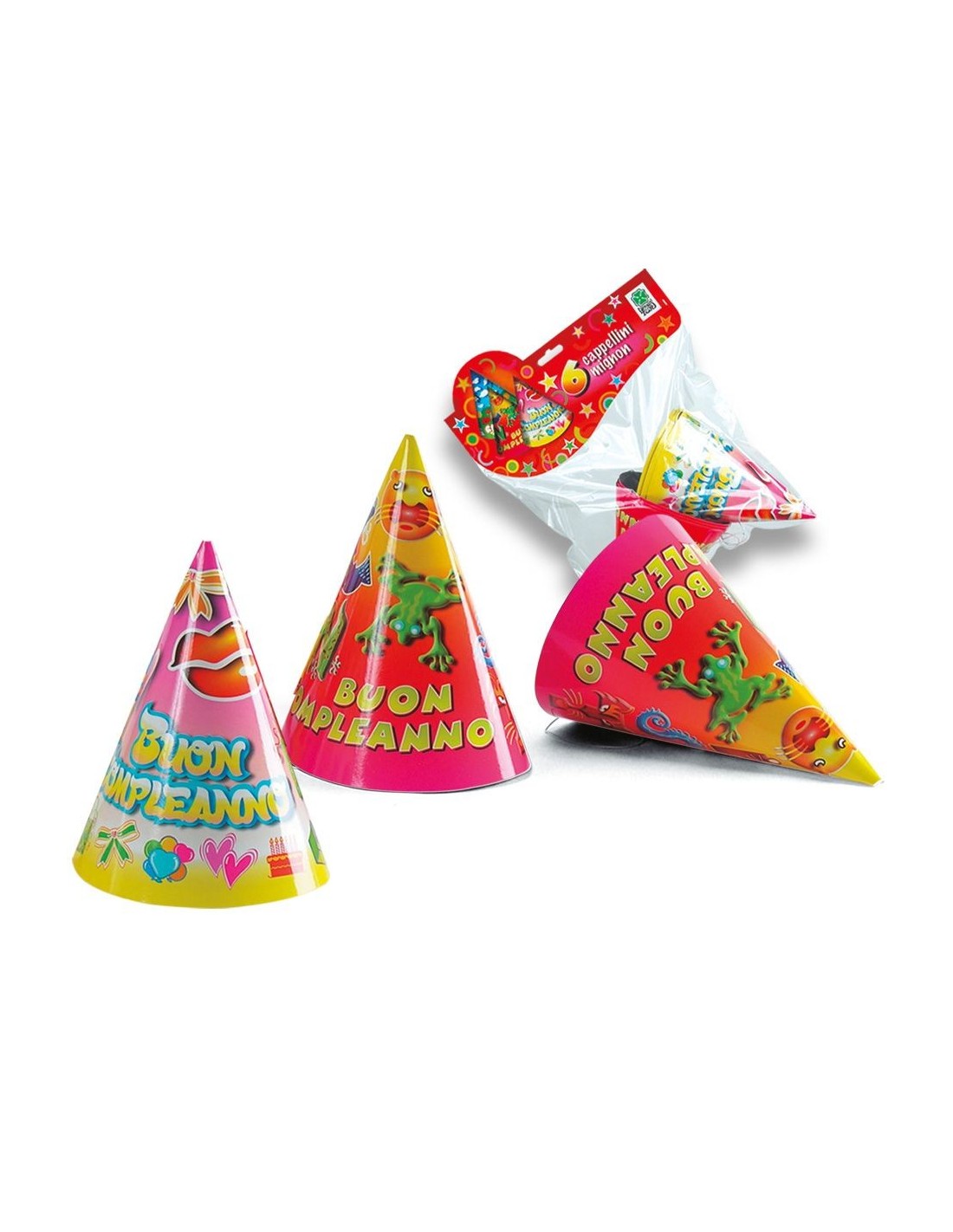 Il set comprende 6 cappellini a cono per festa di compleanno con scritta "BUON COMPLEANNO" in colori vivaci assortiti. I cappellini sono realizzati in cartoncino resistente con fantasie colorate e decorazioni festose che renderanno ogni celebrazione ancora più allegra. Ogni cappellino ha la classica forma a cono con elastico per tenerlo fermo sulla testa. Perfetti per animare feste di compleanno di bambini e adulti.