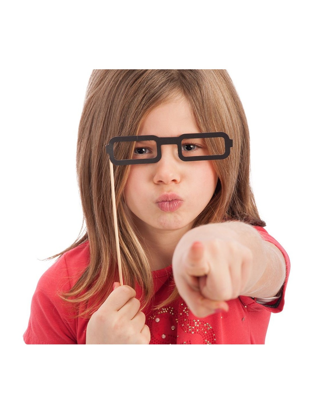 Set da 6 sticks occhiali rettangolari in cartoncino, perfetti per animare qualsiasi festa o evento. Questi divertenti accessori fotografici sono realizzati in cartoncino resistente e dotati di comodi bastoncini per un facile utilizzo. Il set include 6 pezzi pronti all'uso, ideali per creare momenti di divertimento e scatti fotografici memorabili. Gli occhiali dalla forma rettangolare classica si adattano a tutte le età e sono perfetti per photo booth improvvisati.