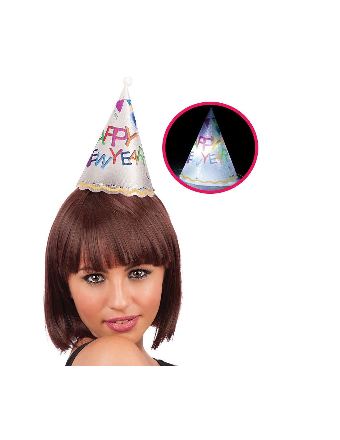 Questo cappellino luminoso Happy New Year in plastica è l'accessorio perfetto per dare il benvenuto al nuovo anno con stile e allegria. Dotato di luci LED integrate che si illuminano automaticamente, il cappello presenta la scritta colorata "Happy New Year" su sfondo iridescente. Alto circa 18 cm, include le batterie necessarie per il funzionamento delle luci. Il materiale in plastica leggera garantisce comfort durante tutta la festa, mentre il sistema di fissaggio permette di indossarlo facilmente.