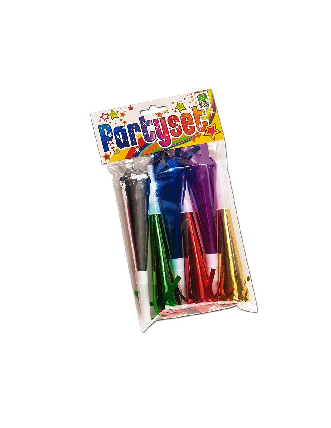 Questo vivace set include 6 trombe metalliche lunghe 18 cm ciascuna, perfette per animare ogni celebrazione con allegria e colore. Le trombe sono realizzate in materiale metallizzato brillante e presentano una gamma di colori vivaci: oro, argento, rosso, verde, blu e viola. Ogni tromba produce un suono festoso ideale per scandire i momenti più divertenti delle tue feste. Il set è confezionato in una pratica busta trasparente che mantiene insieme tutti gli elementi.