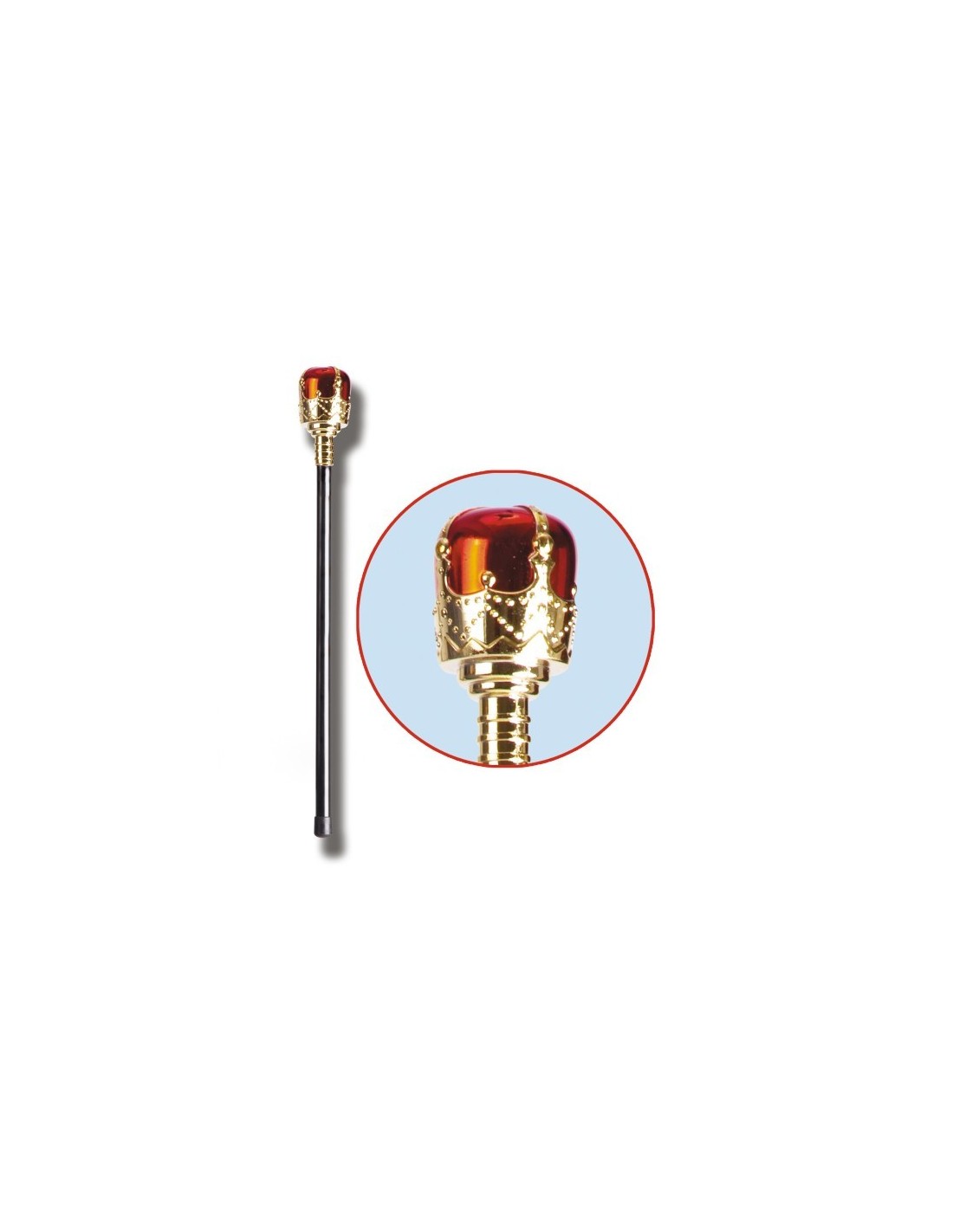 Elegante scettro da re lungo 48 centimetri, realizzato con finiture dorate che conferiscono un aspetto regale e maestoso. L'accessorio presenta dettagli decorativi elaborati nella parte superiore, con elementi rossi che impreziosiscono il design complessivo. Perfetto per completare costumi da sovrano, re medievale o personaggi di corte, questo scettro è l'elemento indispensabile per trasformarsi in un vero monarca. Il design ricercato e le proporzioni equilibrate rendono questo accessorio un elemento distintivo per ogni travestimento regale.