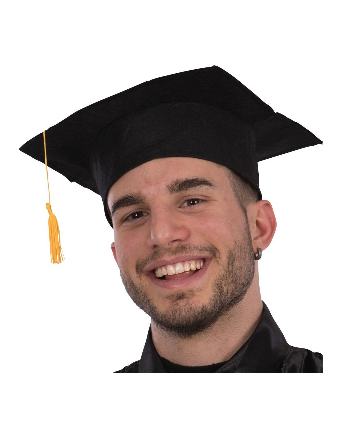 Cappello laureato nero con nappa dorata indossato da giovane sorridente per cerimonia di laurea