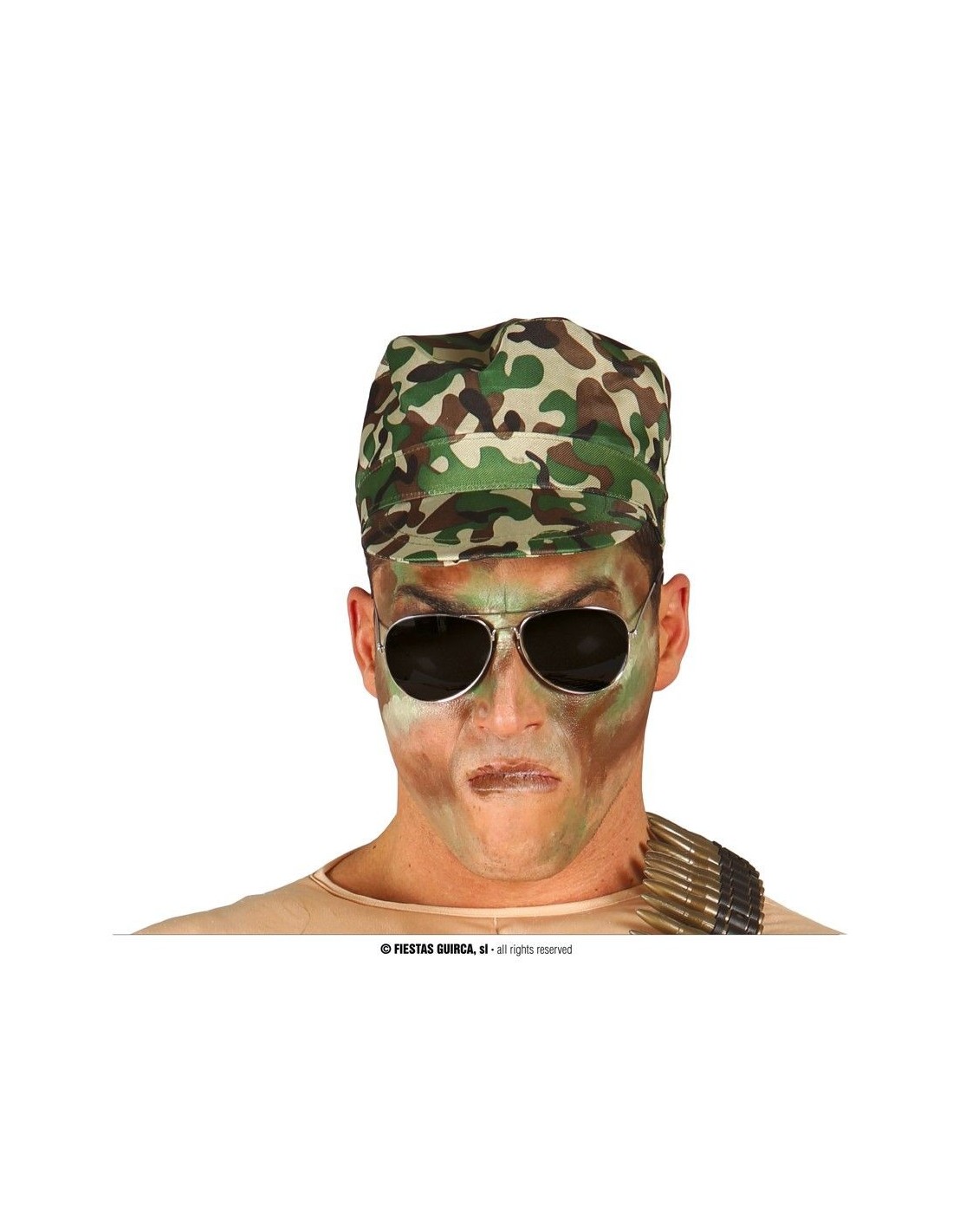 Cappello militare con motivo mimetico nei toni del verde, marrone e nero, perfetto per completare il tuo costume da soldato o militare. Questo copricapo presenta il classico design dell'equipaggiamento militare con pattern camouflage realistico. Realizzato in tessuto resistente, offre comfort e vestibilità durante l'uso. Accessorio indispensabile per trasformazioni a tema bellico e avventuroso.