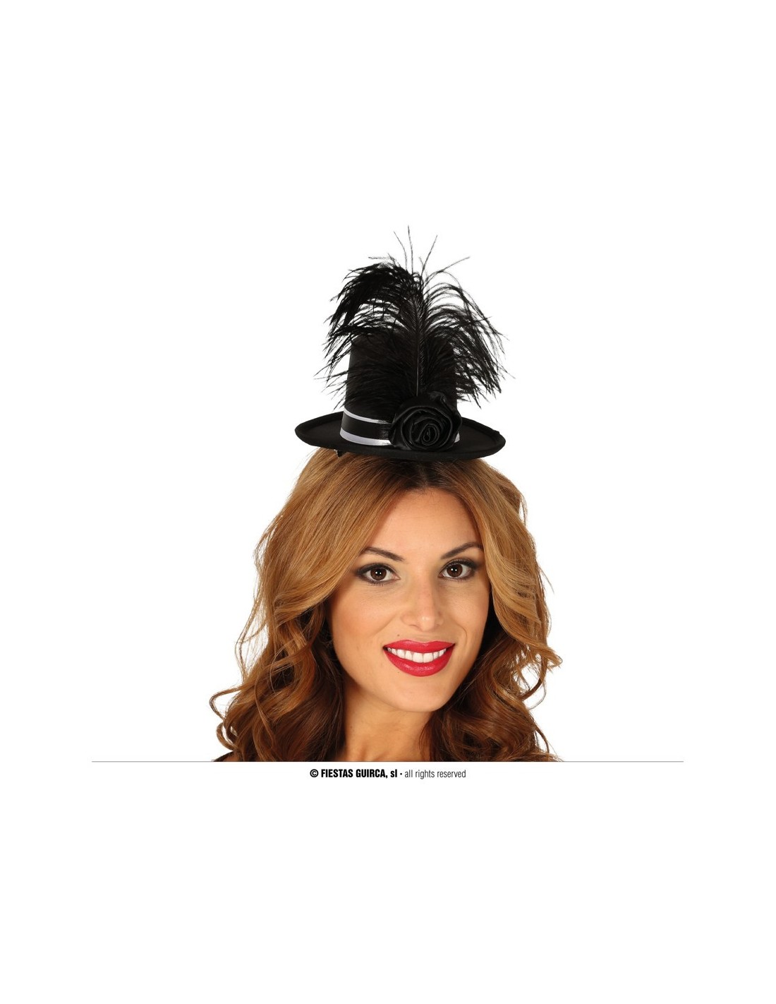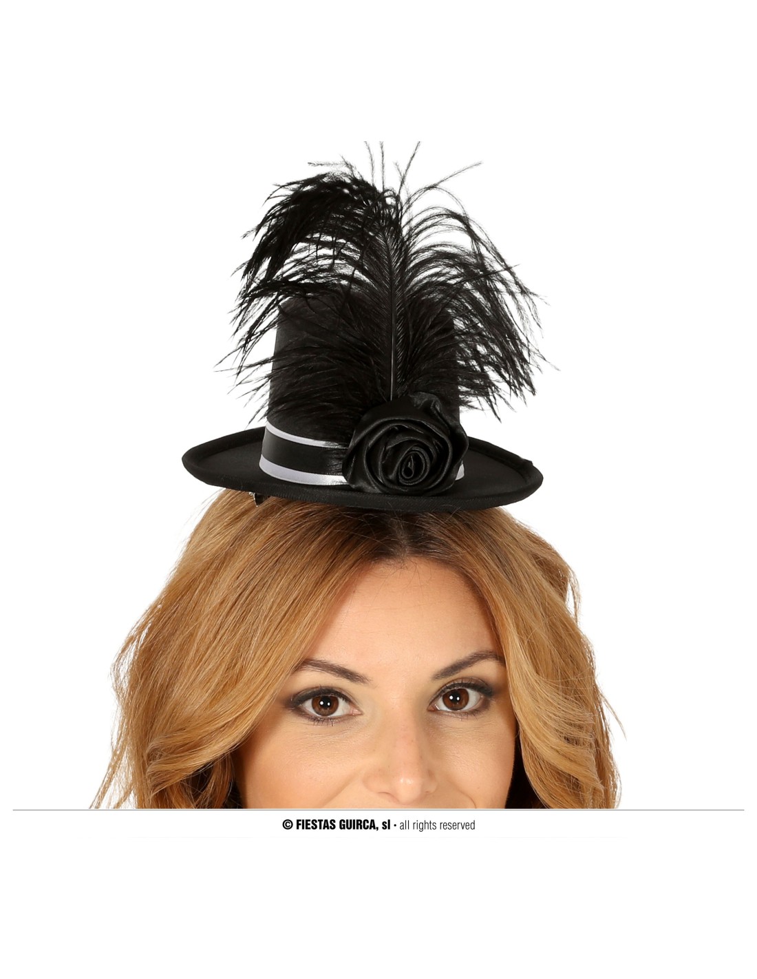Il mini cilindro nero con fiore e piume è l'accessorio perfetto per completare look eleganti e sofisticati. Questo cappellino in miniatura presenta una raffinata decorazione floreale nera accompagnata da morbide piume che creano un effetto scenografico di grande impatto. Il design classico del cilindro in versione ridotta si adatta perfettamente alla testa grazie alla sua struttura compatta. L'accessorio è realizzato con materiali resistenti che mantengono la forma nel tempo, mentre i dettagli decorativi aggiungono un tocco di classe e originalità al costume.