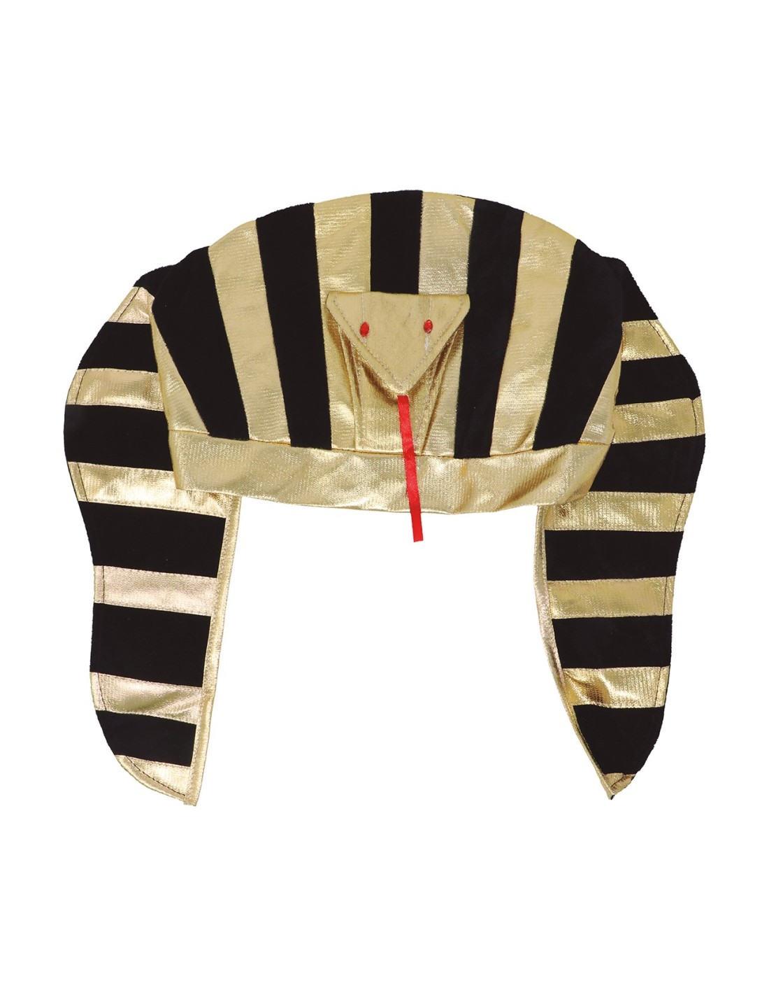 Maestoso copricapo da faraone egiziano realizzato in tessuto con eleganti strisce dorate e nere. Questo cappello faraone presenta il classico design del nemes, il copricapo cerimoniale dei sovrani dell'antico Egitto, con dettagli metallizzati che ricreano l'iconico look regale. Il copricapo è caratterizzato da bande alternate oro e nero che si estendono sui lati, completato dalla tipica fascia frontale decorativa. Perfetto per trasformarsi in un potente sovrano del Nilo.