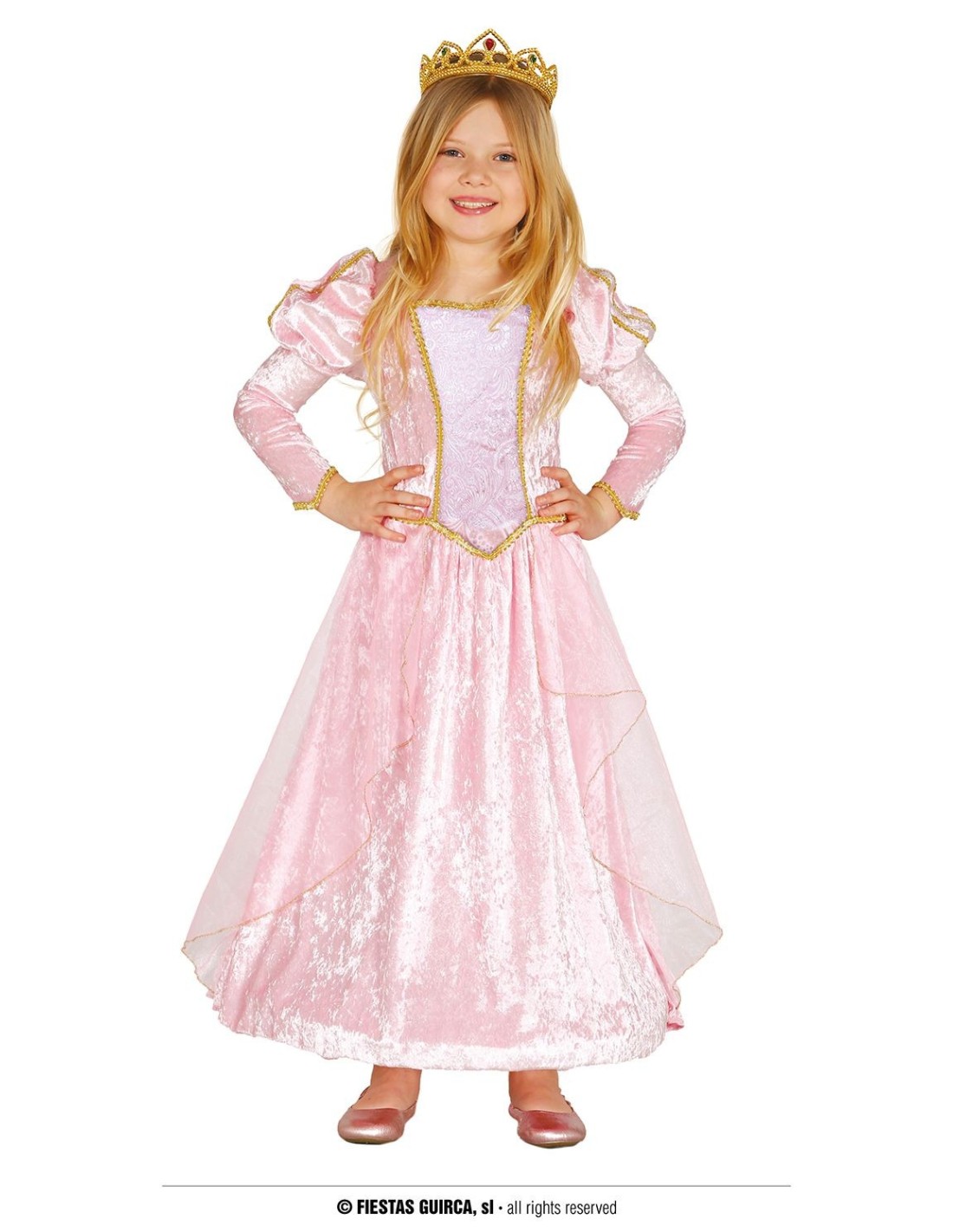 Questo incantevole costume da principessa trasforma ogni bambina in una vera regalina delle fiabe. L'abito presenta un corpetto rosa con dettagli dorati e maniche lunghe slegate, abbinato a una gonna ampia e vaporosa che scende fino alle caviglie. Il set include la corona dorata per completare il look principesco. Realizzato in tessuto morbido e confortevole, garantisce libertà di movimento durante il gioco. Il costume è disponibile per bambine di 3-4 anni.