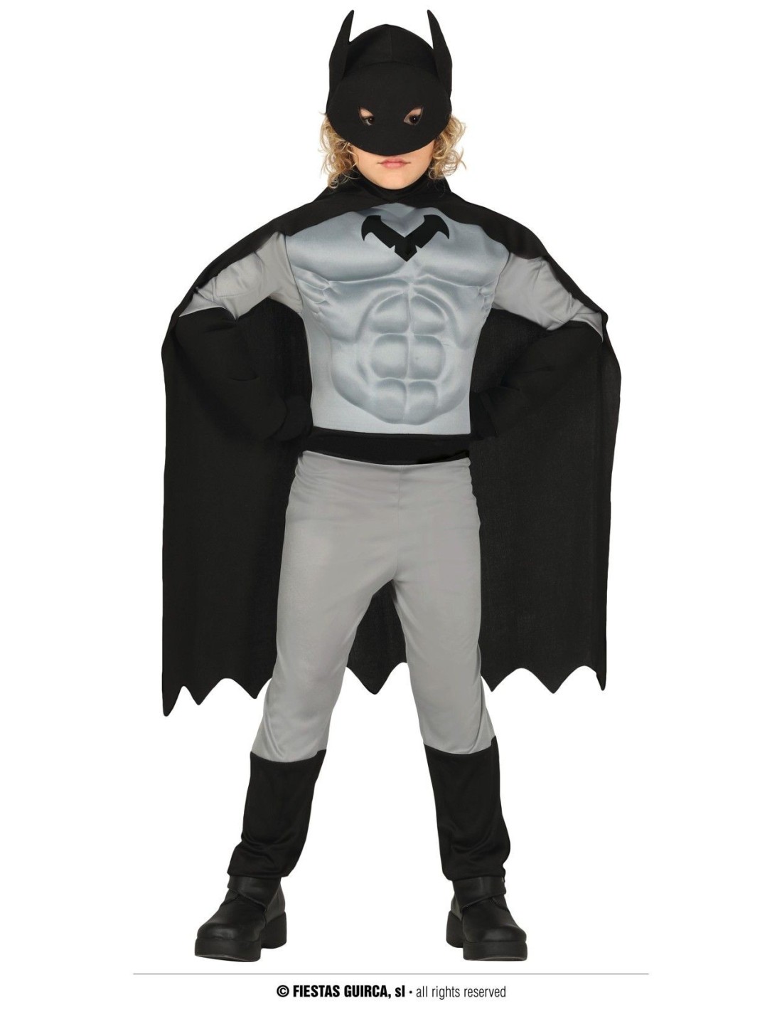 Trasforma il tuo bambino nel celebre supereroe di Gotham City con questo costume Batman completo di mantello nero, tuta grigia con muscolatura imbottita e iconico simbolo del pipistrello sul petto. Il set include maschera nera con orecchie appuntite, tutina grigia e nera con dettagli muscolosi stampati e ampio mantello nero per un effetto scenico garantito. Realizzato in tessuto morbido e confortevole, perfetto per ore di gioco e avventure da supereroe.