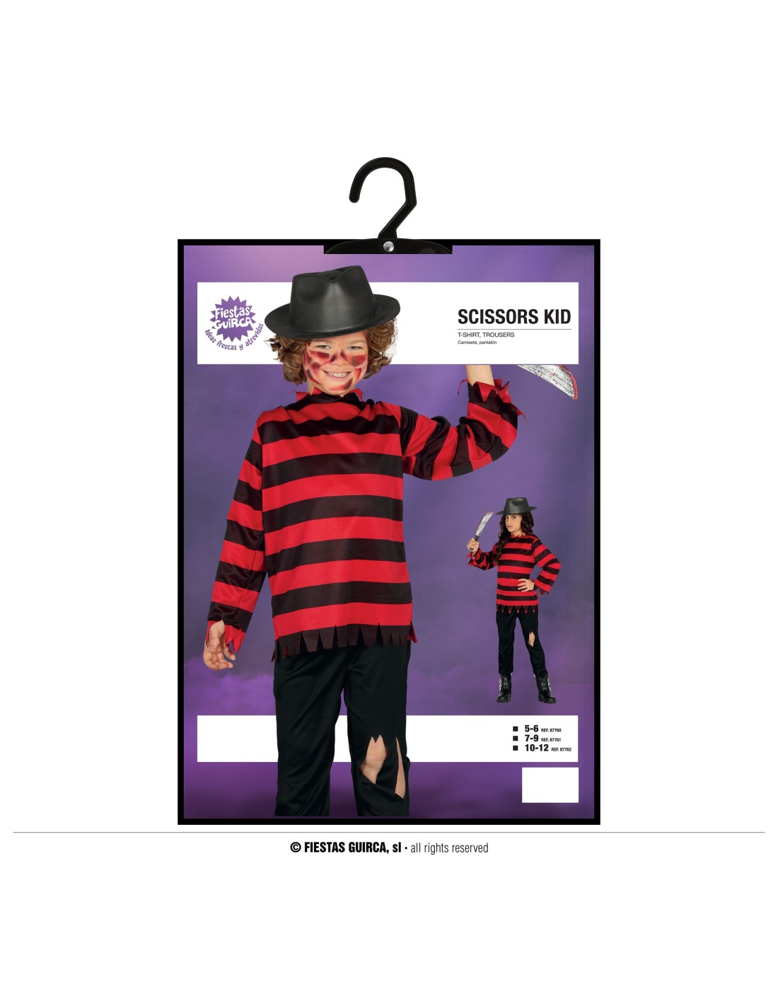 Il costume da Freddy Krueger trasforma ogni bambino nel terrificante protagonista di Nightmare. Il set comprende una maglia a righe rosse e nere caratteristica del personaggio, pantaloni neri strappati e il tipico cappello nero. L'outfit ricrea fedelmente il look dell'iconico villain dell'horror, perfetto per spaventare amici e parenti durante le feste più paurose dell'anno. Il tessuto morbido garantisce comfort durante tutta la serata, mentre i dettagli accurati rendono il travestimento immediatamente riconoscibile.