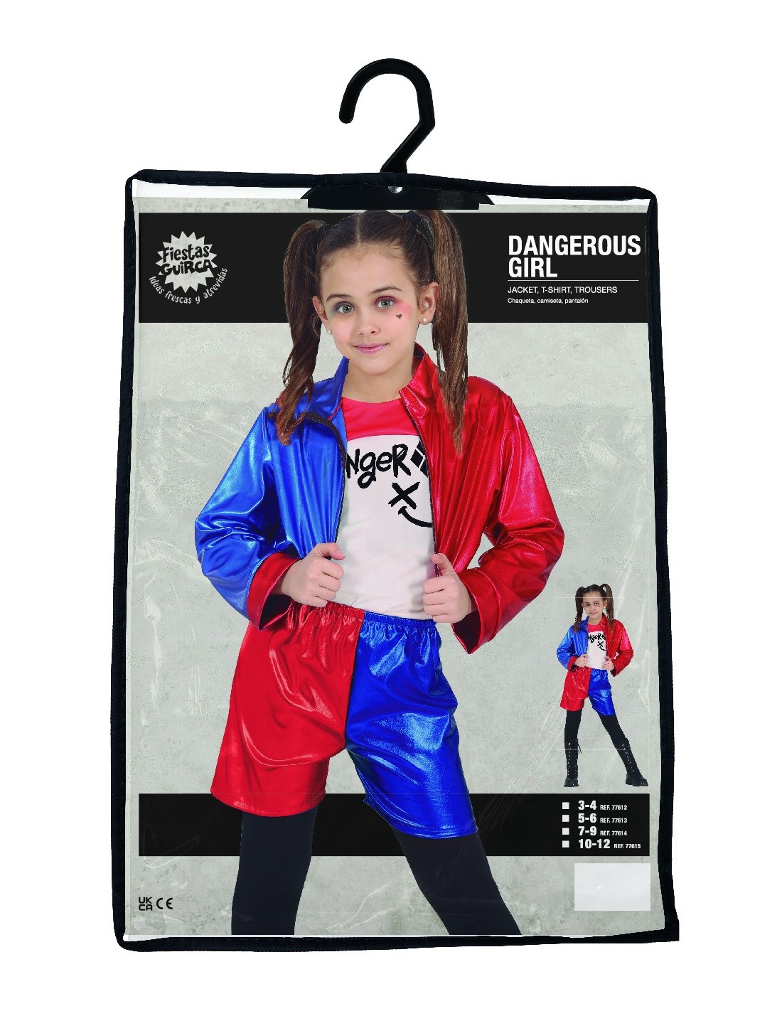 Questo costume da Ragazza pericolosa trasforma le bambine nella famosa antieroina dei fumetti con un look iconico e riconoscibile. Il set include una giacca bomber bicolore rosso e blu in tessuto lucido, shorts coordinati negli stessi colori e una t-shirt bianca con stampa. I pantaloni neri completano l'outfit per un look autentico e d'impatto. Il costume è realizzato in materiali confortevoli che permettono libertà di movimento durante feste e giochi.