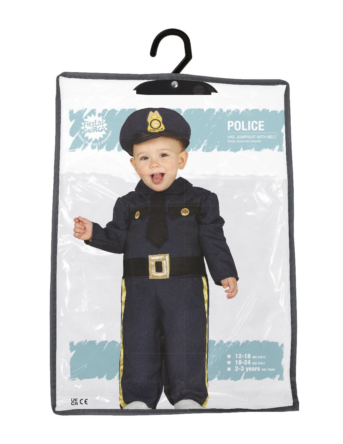 Questo adorabile costume da poliziotto trasformerà il tuo piccolo in un vero agente delle forze dell'ordine. Il set include una divisa blu navy completa con camicia a maniche lunghe, pantaloni coordinati, cintura nera e il caratteristico cappello da poliziotto con distintivo dorato. La divisa presenta dettagli autentici come tasche sul petto, bottoni dorati e una cravatta nera che completano il look professionale. Perfetto per bambini dai 2 ai 3 anni, questo costume garantisce libertà di movimento durante il gioco.