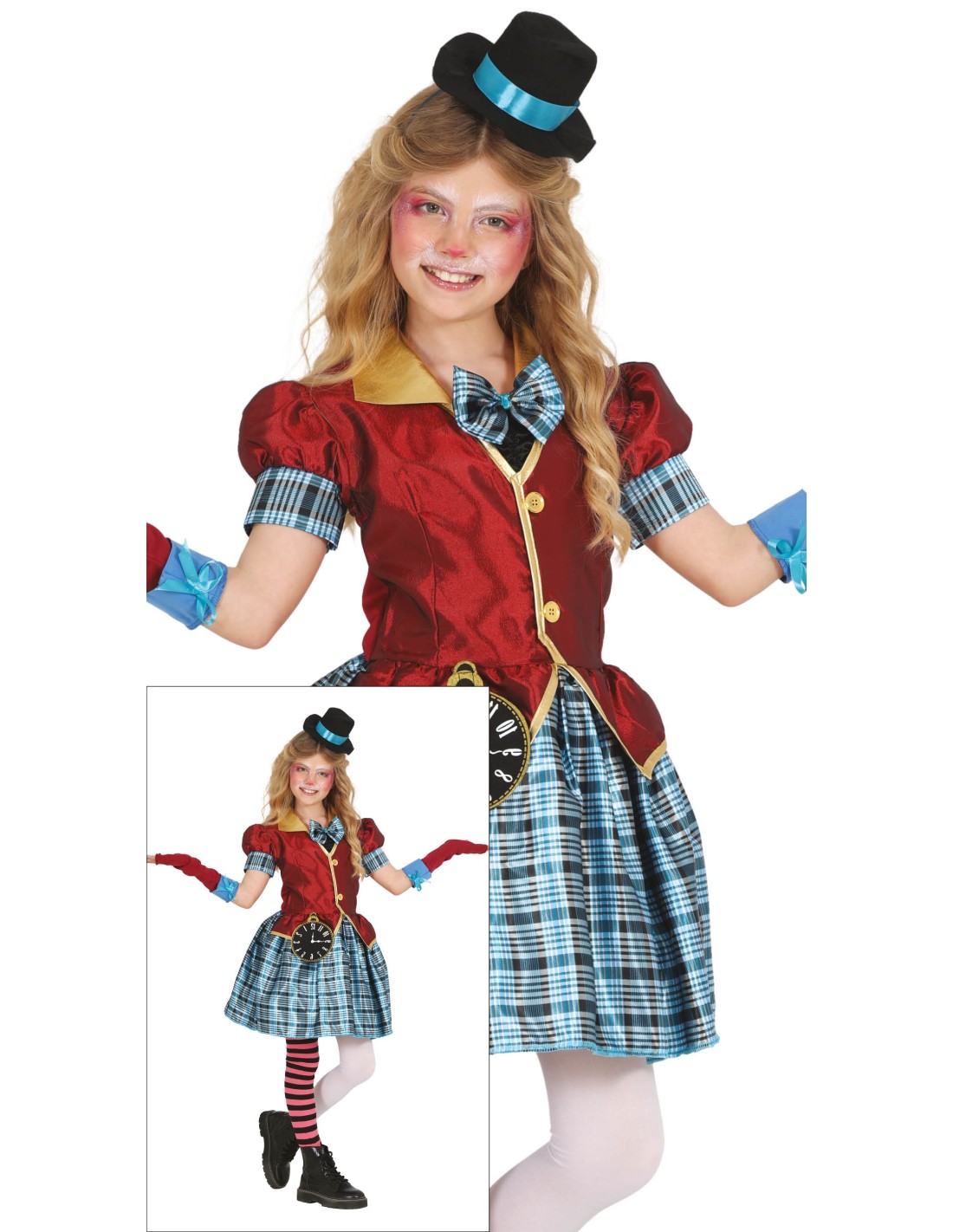 Trasformati nella versione femminile del famoso Cappellaio Matto con questo affascinante costume ispirato ad Alice nel Paese delle Meraviglie. Il set include un elegante vestito rosso con dettagli in tartan blu, completato da un caratteristico cappello a cilindro nero con fascia azzurra. Il design presenta maniche corte a sbuffo, gilet rosso con bottoni dorati e gonna a fantasia scozzese che ricrea perfettamente l'atmosfera magica del mondo di Alice. Realizzato in tessuto morbido e confortevole, garantisce libertà di movimento durante feste e giochi.
