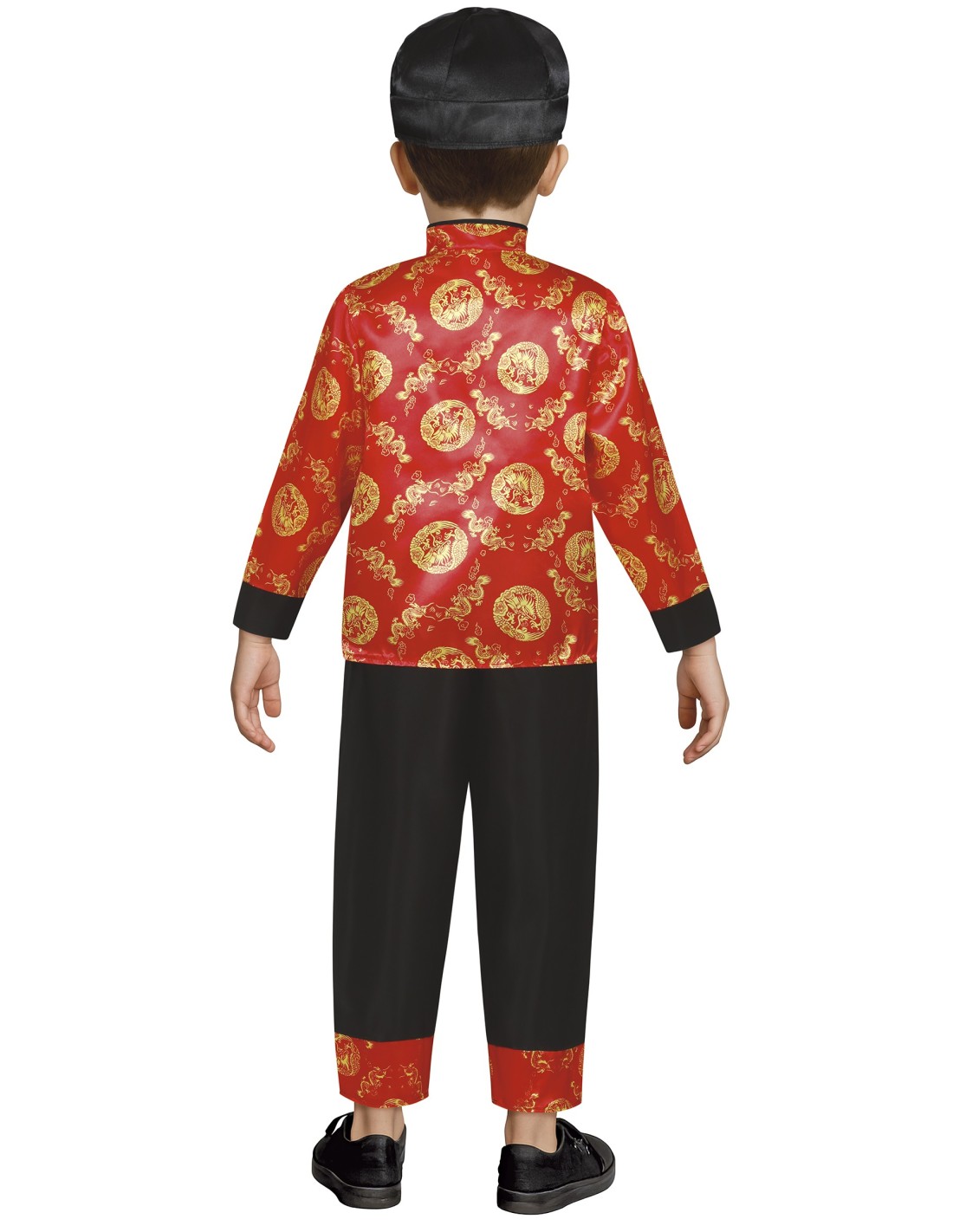 Stupendo costume orientale cinese per bambino che riporta alla tradizione dell'antico Impero del Dragone. Il set comprende una casacca rossa decorata con eleganti dragoni dorati e simboli della fortuna, completata da pantaloni neri coordinati. La tunica presenta bottoni tradizionali e maniche con polsini neri a contrasto, mentre i dettagli oro creano un effetto scenico di grande impatto. Realizzato in tessuto confortevole, permette libertà di movimento durante le feste e gli eventi.
