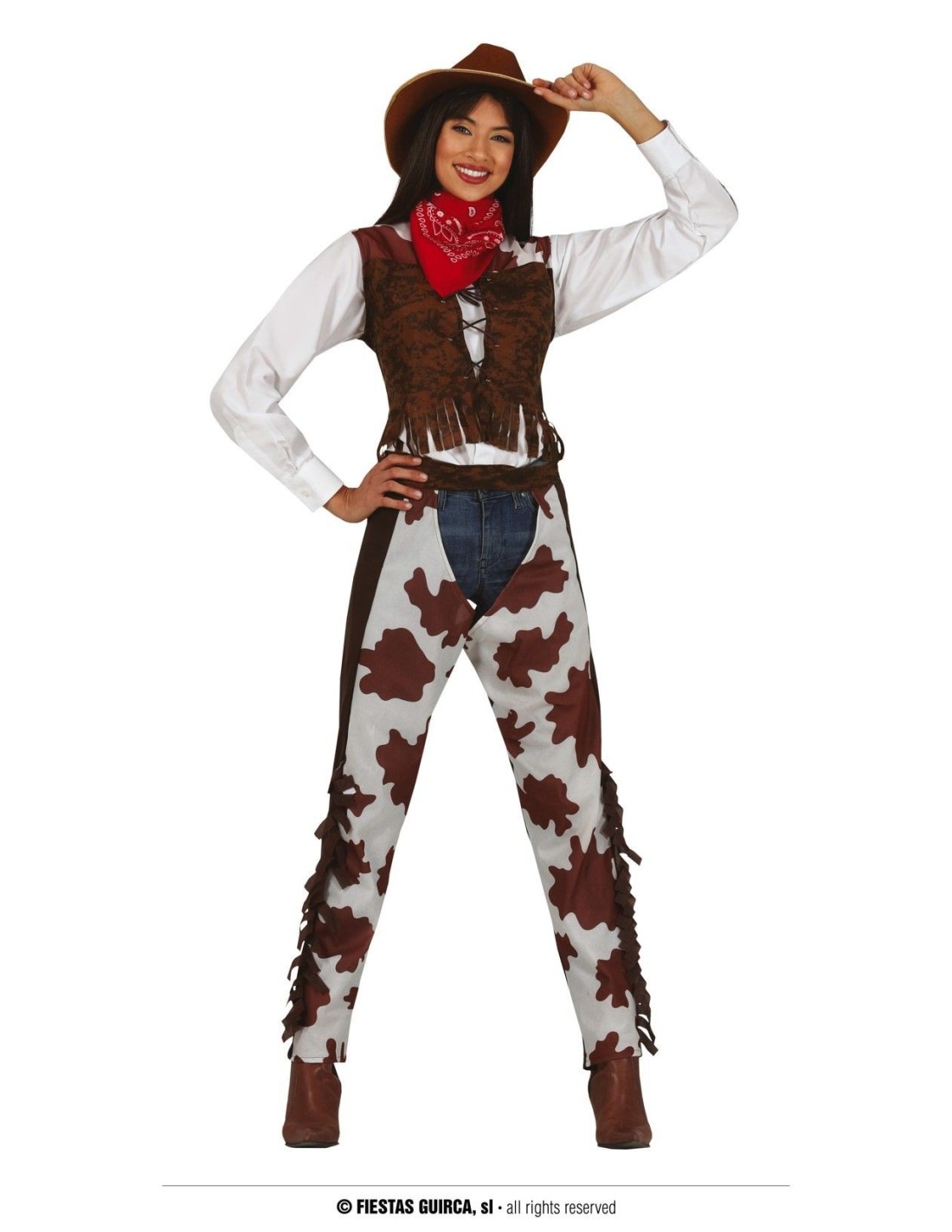 Trasformati nella perfetta cow girl del Far West con questo costume western completo. Il set include una camicia bianca, un gilet marrone con frange decorative, pantaloni a fantasia macchie marroni e bianche, e un bandana rosso. Le frange sui pantaloni e sul gilet creano un movimento autentico che richiama lo stile delle praterie americane. Il costume è realizzato in tessuto misto che garantisce comfort e vestibilità durante tutto l'evento.