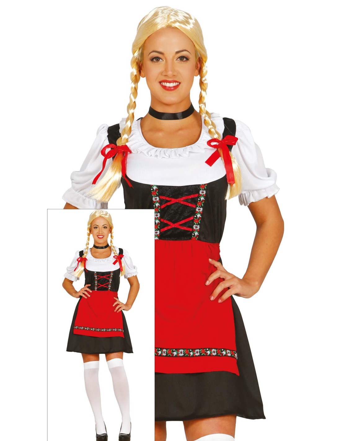 Il costume Tirolese da donna richiama la tradizionale abbigliamento bavarese con il suo caratteristico design. Il set comprende una camicia bianca con maniche a sbuffo, un corpetto nero con lacci decorativi rossi e una gonna rossa con fascia nera decorata. L'outfit è completato da fiocchetti rossi sulle spalline che aggiungono un tocco autentico al look tradizionale. Il costume presenta i colori classici del dirndl bavarese: bianco, nero e rosso con dettagli decorativi tipici della tradizione alpina.