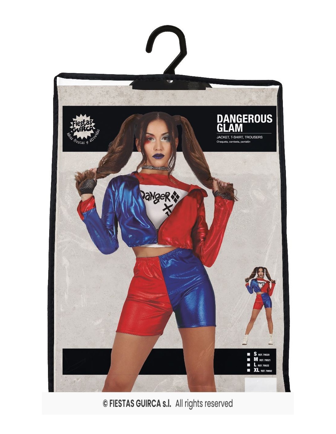 Trasformati nella villain più amata di Gotham City con questo costume da Harley Quinn completo e dettagliato. Il set comprende una giacca corta con zip frontale in ecopelle lucida bicolore rosso e blu, shorts coordinati e top bianco con scritta. L'outfit riproduce fedelmente il look iconico del personaggio, con colori vivaci e design asimmetrico che cattura perfettamente lo spirito ribelle e giocoso di Harley Quinn.