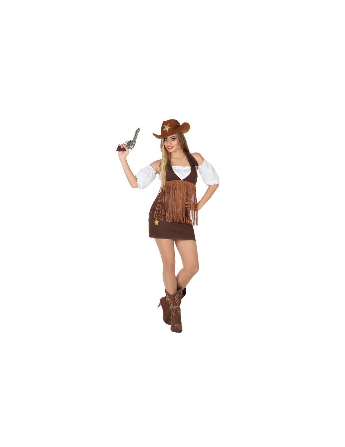 Trasformati nella più affascinante cow girl del Far West con questo costume completo che ti catapulterà nell'epoca dei pionieri americani. Il set include un elegante vestito marrone con corpetto e gonna corta, arricchito da caratteristiche frange che si muovono ad ogni passo, una camicia bianca con maniche ampie e l'iconico cappello da cowboy. Il design western autentico combina praticità e fascino, perfetto per incarnare lo spirito libero delle donne della frontiera americana.