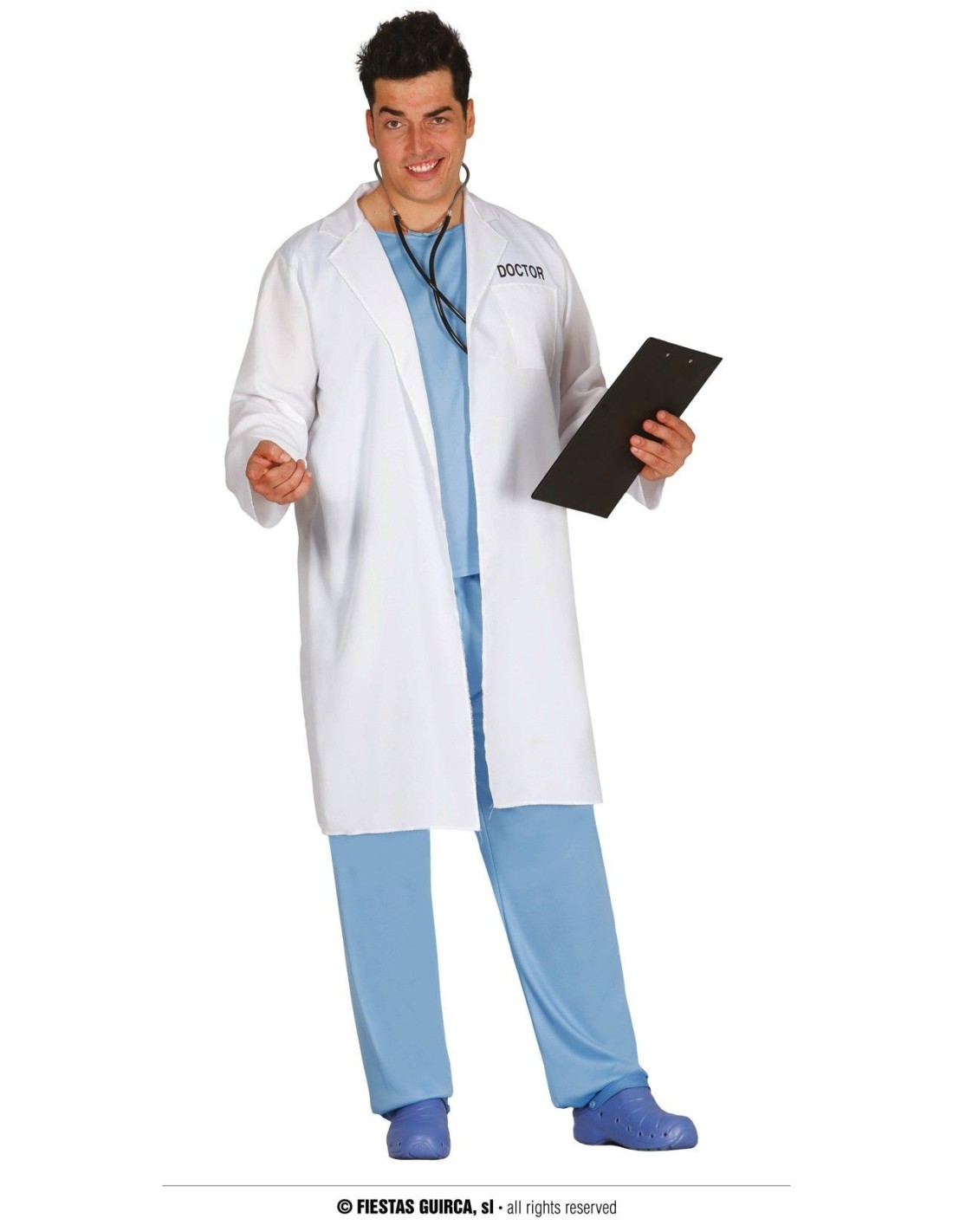Il costume da dottore è perfetto per trasformarti in un medico professionale durante le tue feste in maschera. Questo travestimento include un elegante camice bianco lungo, pantaloni azzurri coordinati e l'immancabile stetoscopio per completare il look medico. Il camice presenta il logo 'DOTTORE' ricamato e una vestibilità comoda che si adatta facilmente. I pantaloni sono realizzati in tessuto leggero di colore azzurro ospedaliero, mentre il camice bianco dona un aspetto autentico e professionale.