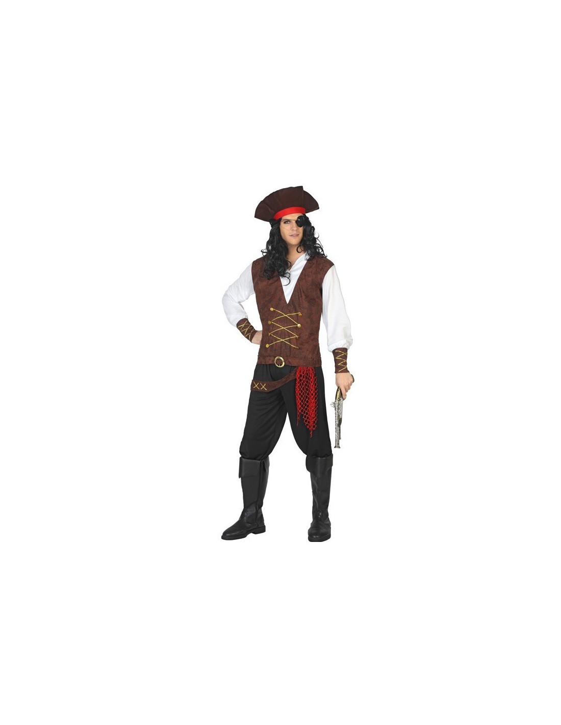 Diventa il pirata più temuto dei sette mari con questo costume completo che include tutto il necessario per una perfetta trasformazione. Il set comprende un elegante gilet marrone con bottoni decorativi, una camicia bianca con maniche ampie, pantaloni neri, una fascia rossa per la vita, un cappello da pirata nero e una bandana rossa. Il look viene completato da stivali neri che arrivano sotto al ginocchio. Ogni elemento è pensato per ricreare fedelmente l'aspetto del classico pirata dei Caraibi, con dettagli curati che rendono il costume perfetto per qualsiasi occasione.