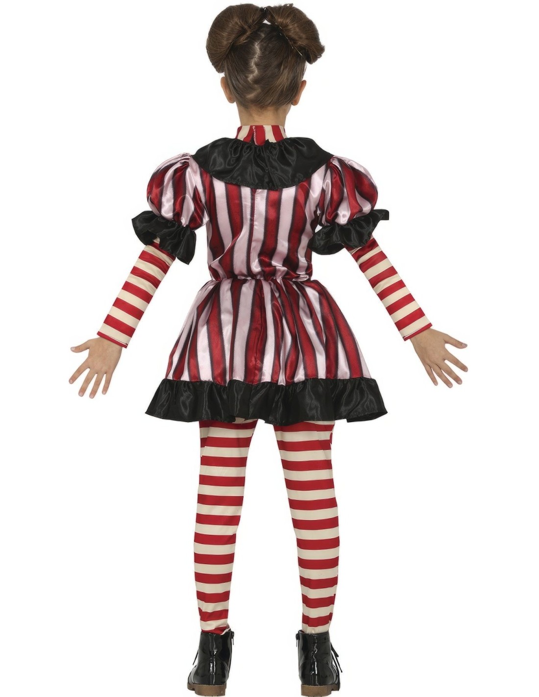 Questo inquietante costume da clown horror trasformerà la bambina nel personaggio più spaventoso della festa. Il set comprende un abito a righe rosse e bianche con dettagli neri, colletto arricciato e gonna voluminosa, completato da calze a righe coordinate. Il look terrifico è arricchito da accessori che rendono il travestimento ancora più realistico e d'effetto. Perfetto per chi vuole stupire con un personaggio iconico del genere horror, questo costume garantisce un impatto scenico straordinario.