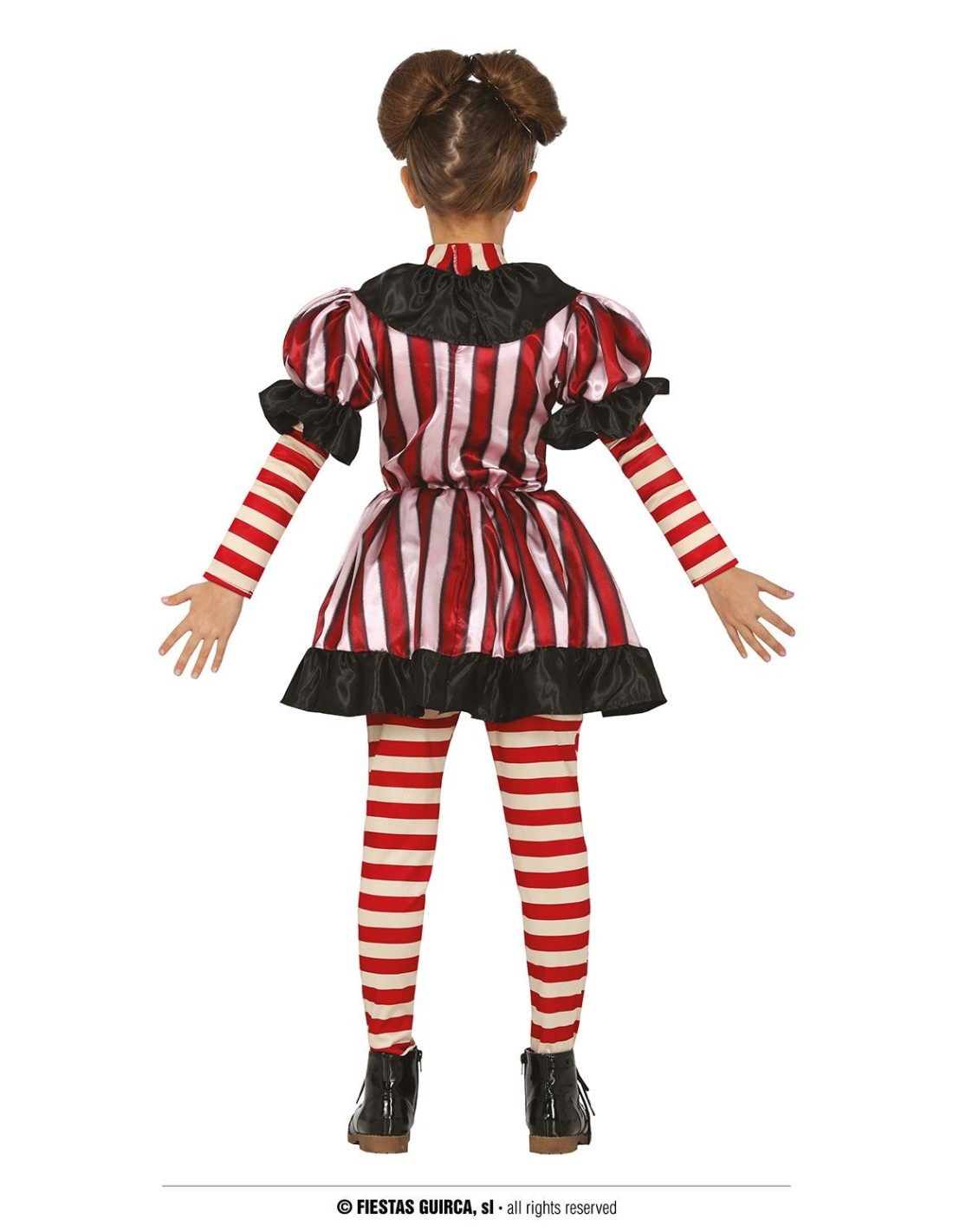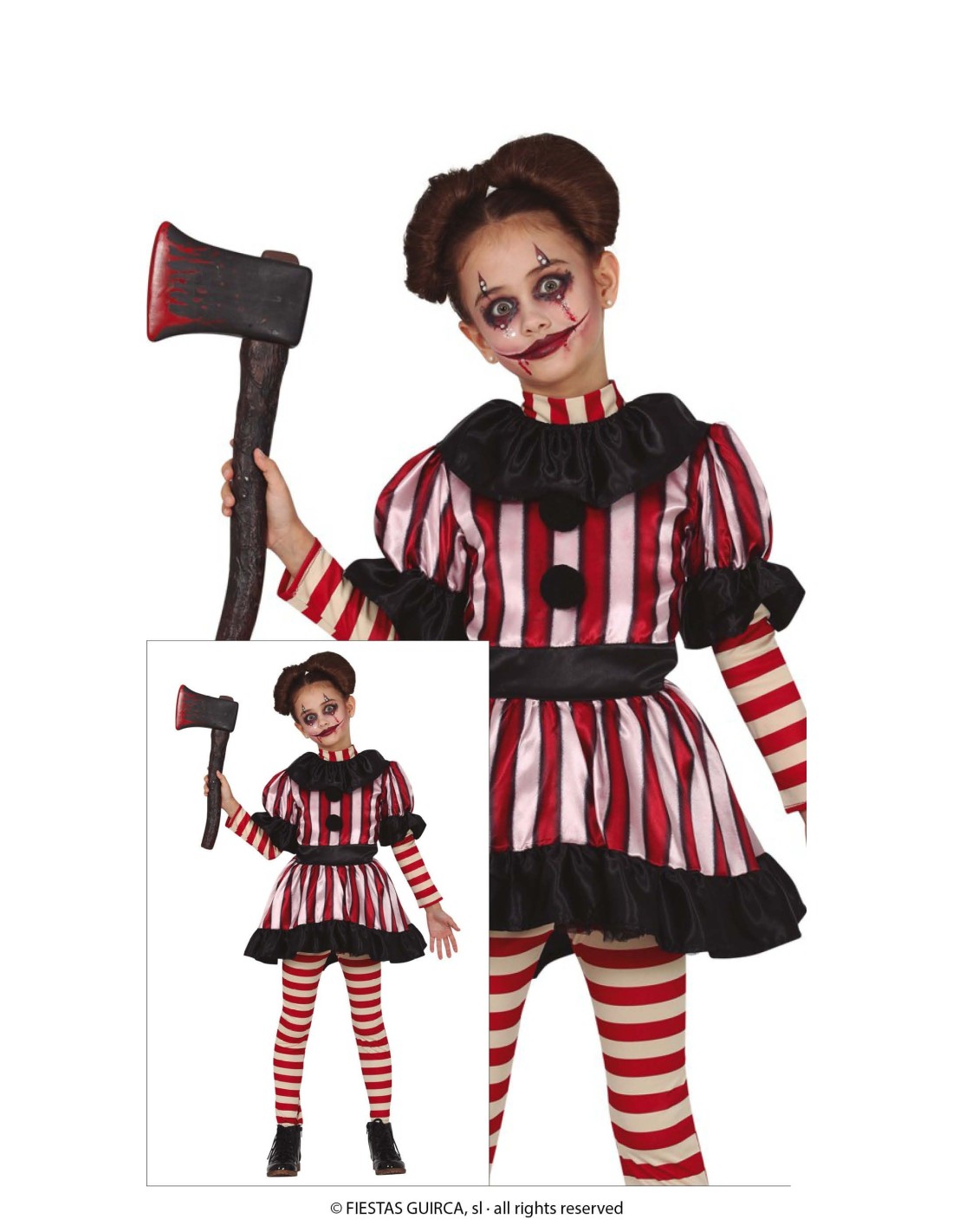 Questo inquietante costume da clown horror trasformerà la tua bambina nel personaggio più spaventoso della festa. Il set include un abito a righe rosse e bianche con dettagli neri, colletto arricciato, cintura coordinata e calze a righe abbinate. L'outfit è completato da un'ascia giocattolo che renderà il travestimento ancora più terrifico. Perfetto per bambine dai 7 ai 9 anni che vogliono stupire con un look da brivido.