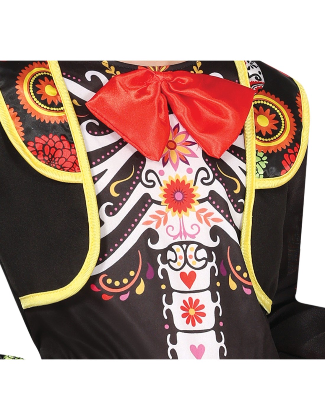 Il costume da scheletro mariachi trasforma i bambini nel perfetto musicista dei morti messicano, combinando l'iconografia del Día de los Muertos con il fascino della tradizione mariachi. Il set include una elegante giacca nera con dettagli dorati e decorazioni rosse, pantaloni coordinati, e il caratteristico sombrero nero con bordature rosse. La tuta presenta stampe di ossa stilizzate e motivi floreali tipici della cultura messicana, mentre il design permette movimenti liberi per ballare e suonare. Perfetto per celebrare Halloween con un tocco culturale autentico e colorato.
