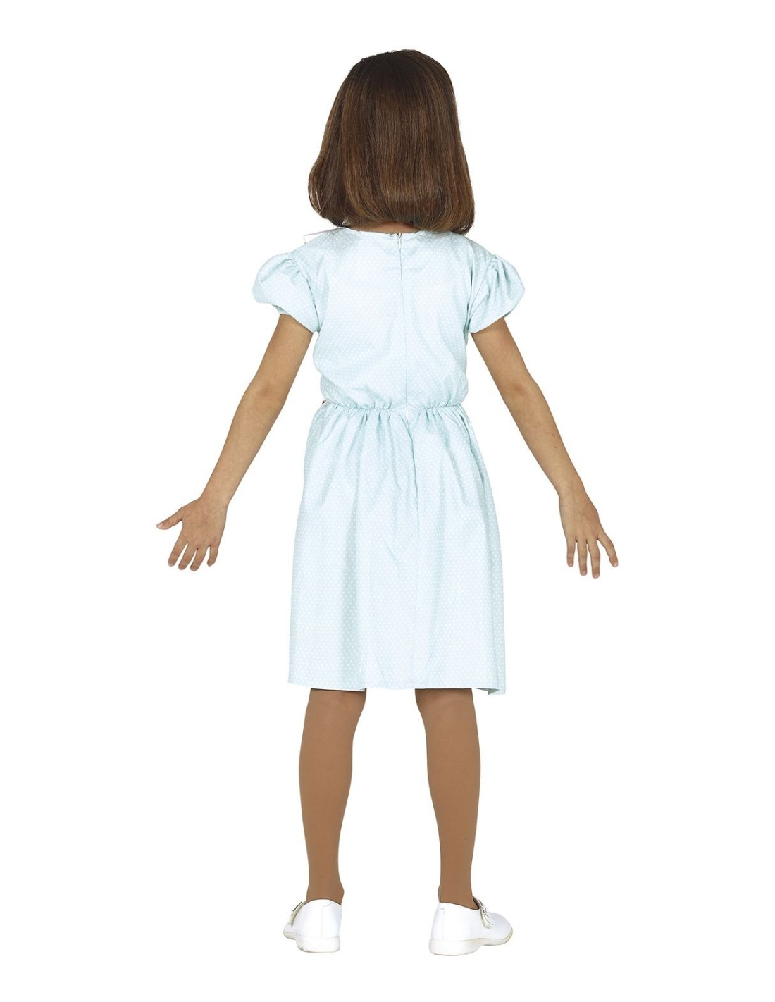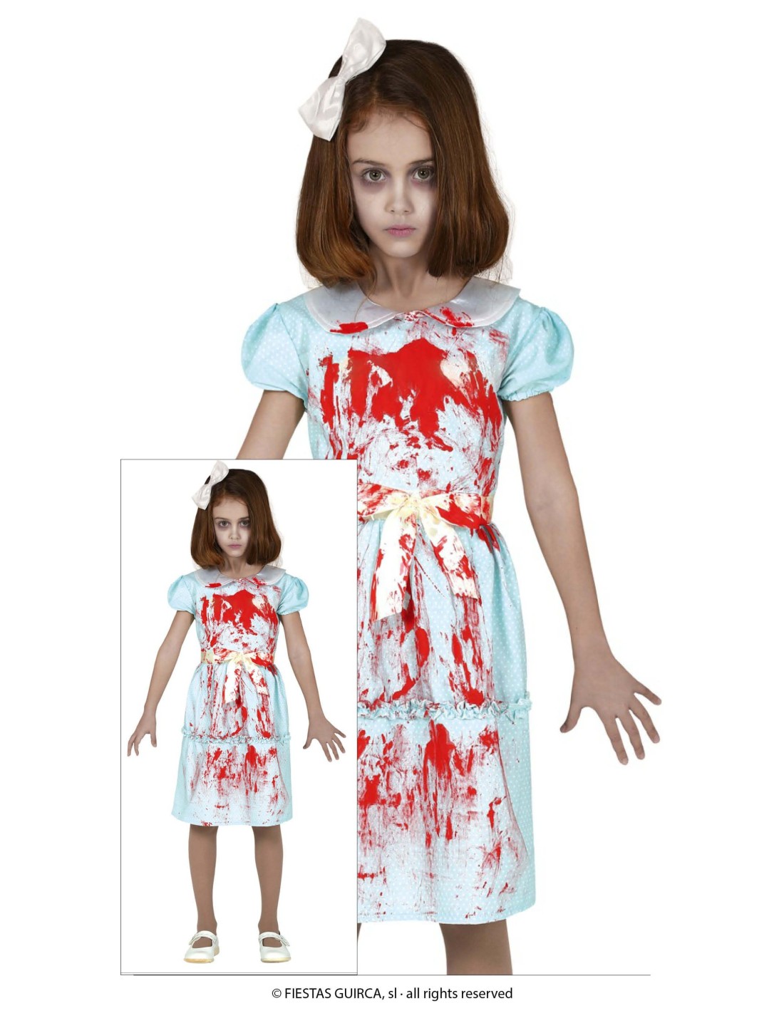 Questo inquietante costume da gemellina fantasma trasformerà la piccola protagonista in uno dei personaggi horror più iconici del cinema. Il set include un elegante vestito azzurro con maniche a sbuffo, completamente decorato con macchie di sangue finto per un effetto terrificante. Il fiocco bianco tra i capelli completa il look da bambina spettrale. Il costume è realizzato in tessuto morbido che garantisce comodità durante le lunghe serate di Halloween.