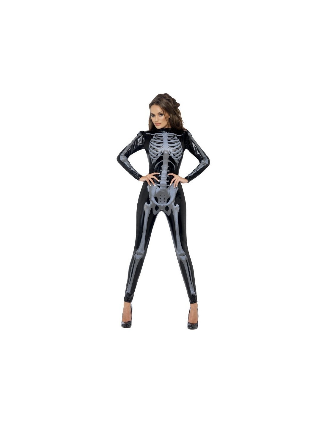 Trasformati in uno scheletro elegante e misterioso con questa tuta aderente che riproduce fedelmente l'anatomia ossea umana. Realizzata in licra elasticizzata di colore nero con stampa scheletrica grigia e bianca, la tuta avvolge perfettamente il corpo creando un effetto realistico e suggestivo. Il design anatomico dettagliato include costole, vertebre, bacino e ossa degli arti, mentre il tessuto elastico garantisce comfort e libertà di movimento durante tutta la serata. La tuta copre completamente il corpo dalle spalle alle caviglie. Le scarpe non sono incluse nel set.