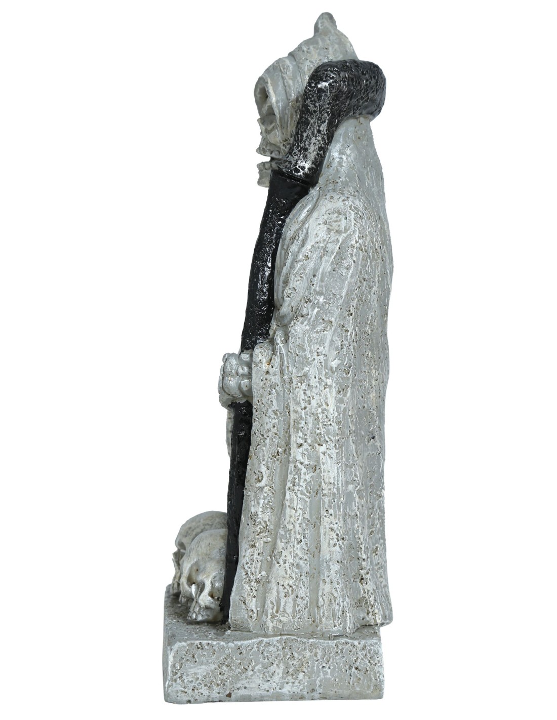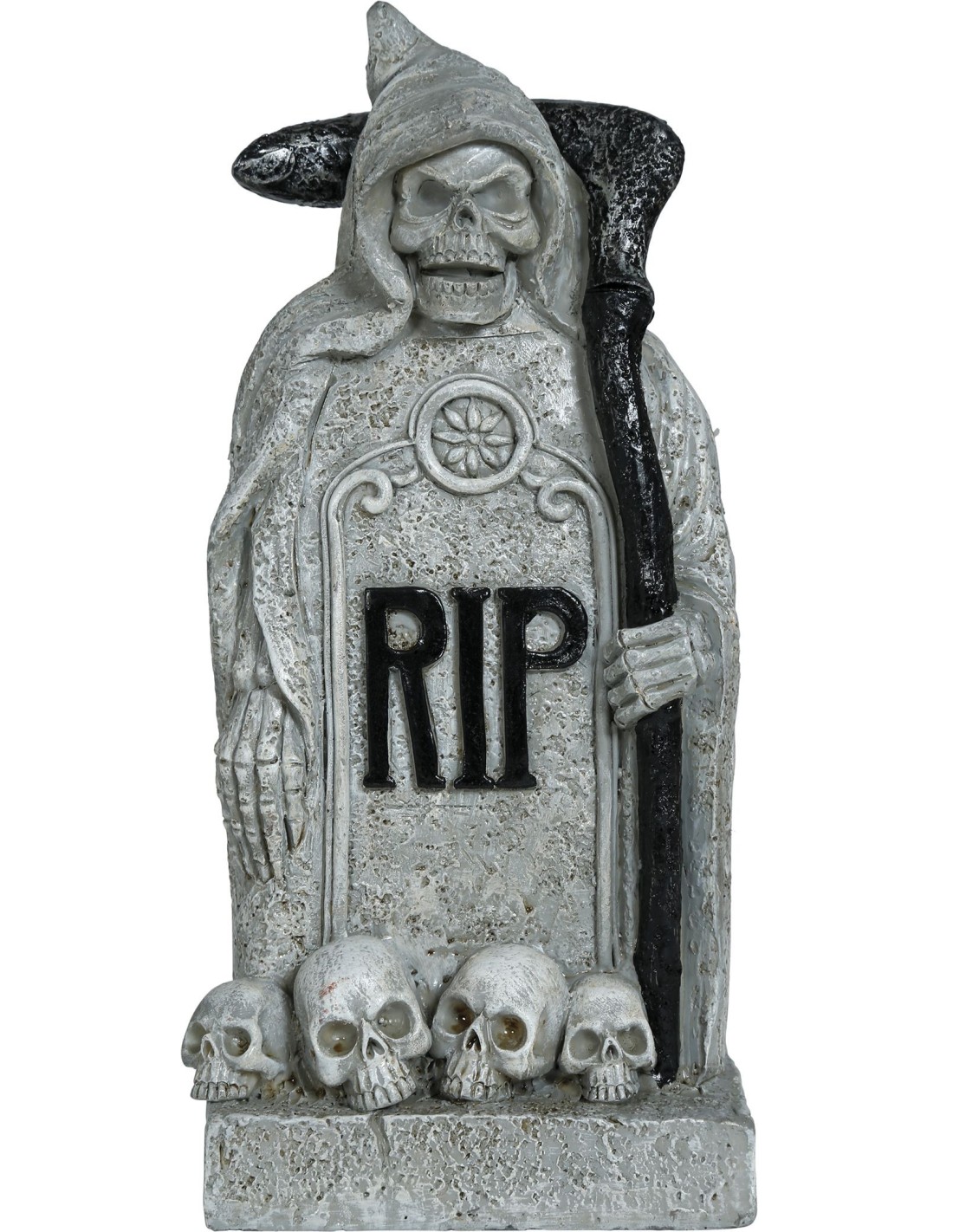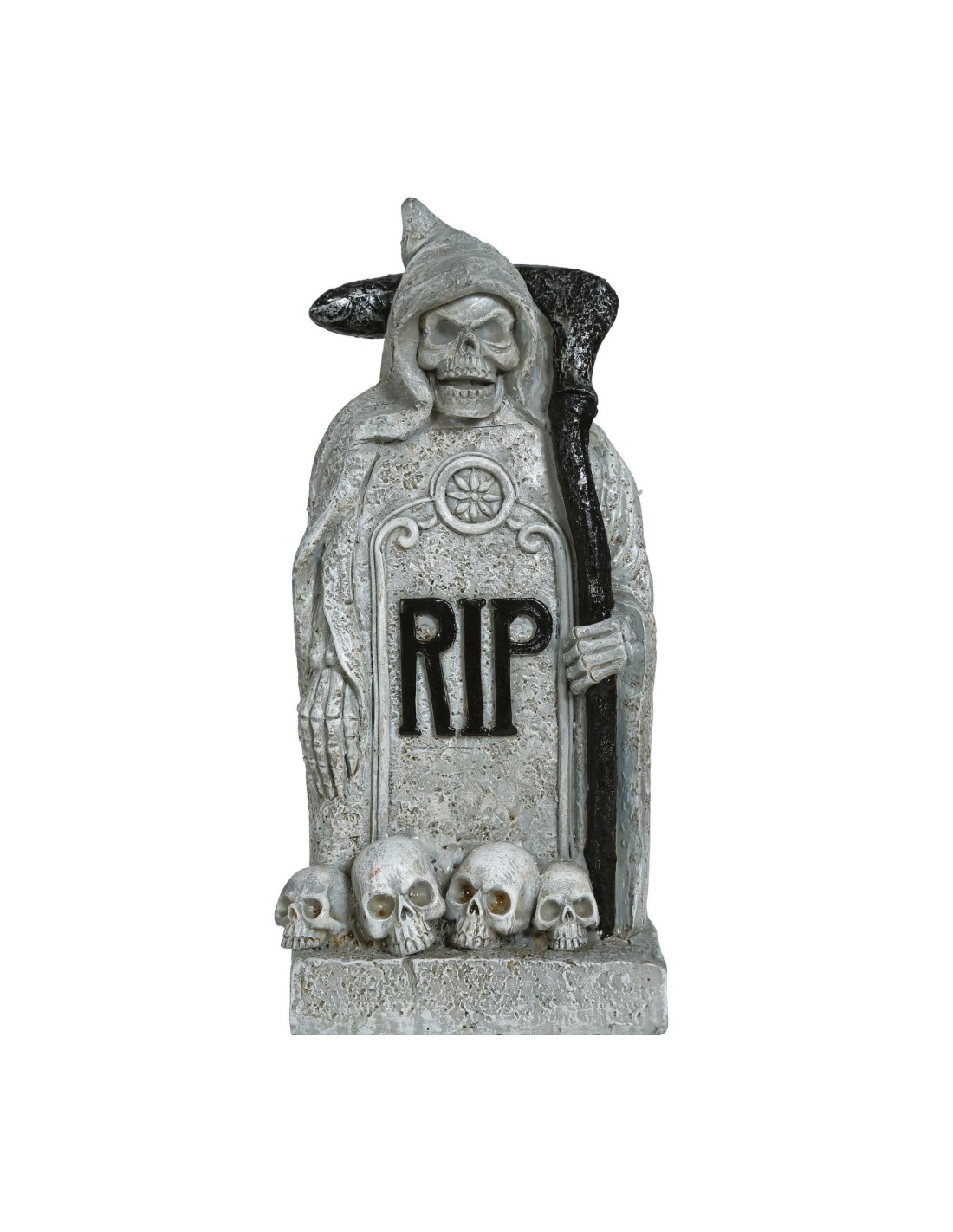 Trasforma il tuo ambiente in un vero cimitero dell'orrore con questa lapide decorativa che raffigura la morte incappucciata. Realizzata in resistente poliresina con effetto pietra invecchiata, presenta la scritta RIP e una serie di teschi alla base per un impatto visivo davvero spaventoso. La figura della morte con cappuccio e falce emerge dal tombstone creando un'atmosfera lugubre e inquietante. Perfetta per allestimenti outdoor e indoor, questa decorazione è stabile e resistente alle intemperie.