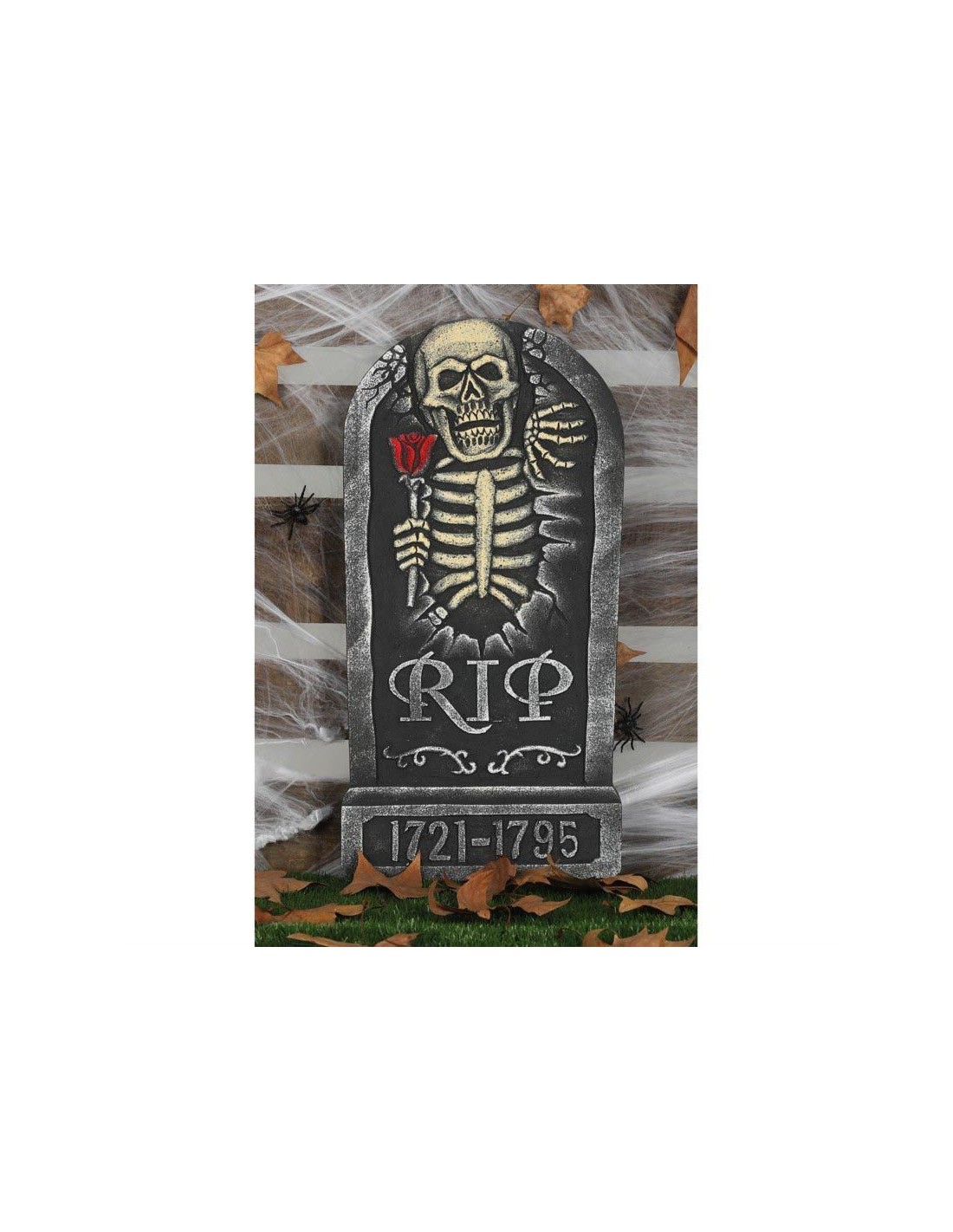 Lapide decorativa dall'aspetto lugubre e inquietante, perfetta per creare un'atmosfera da brividi durante Halloween. Realizzata con effetto pietra tombale invecchiata, presenta un design macabro con scheletro completo inciso sulla superficie, rose rosse e la classica scritta RIP con date 1721-1795. L'elemento decorativo riproduce fedelmente una vera lapide antica con dettagli gotici e simboli mortuari che catturano immediatamente l'attenzione. Ideale per decorare giardini, ingressi, feste private o allestimenti professionali a tema horror.
