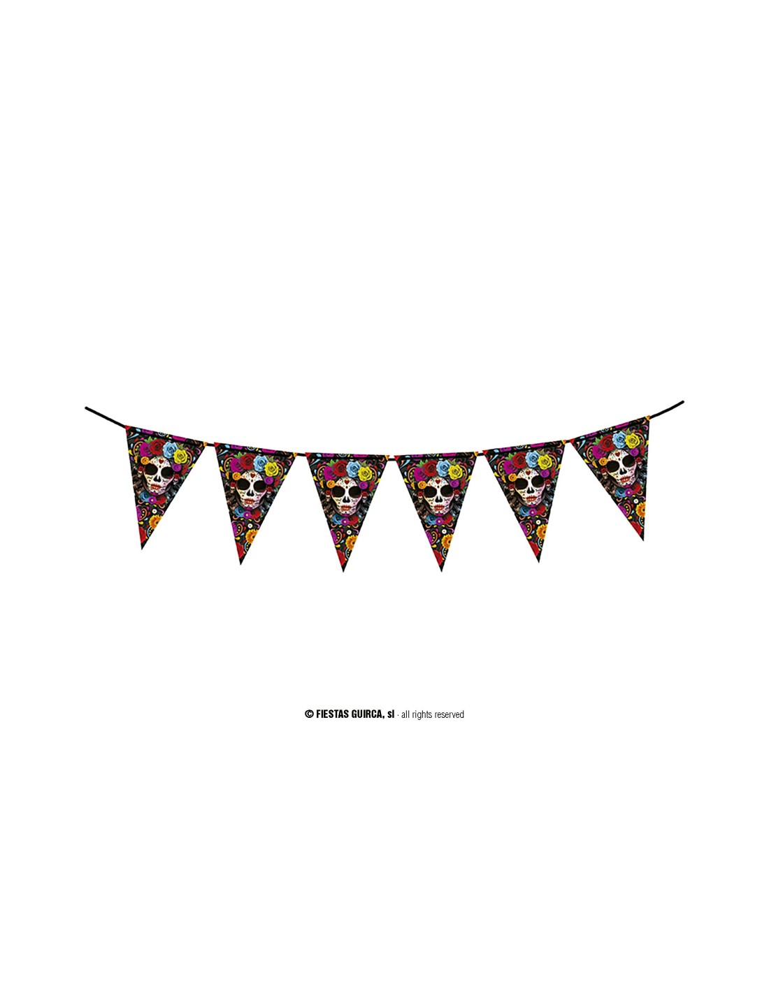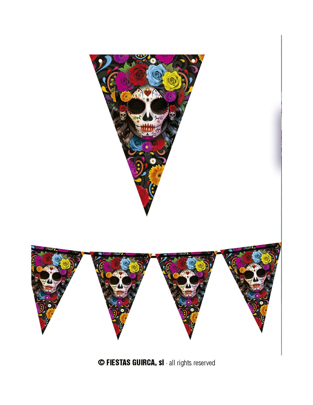 Il gagliardetto Catrina messicana è la decorazione perfetta per creare un'atmosfera autentica del Día de los Muertos. Questo festone di 300 cm è composto da bandierine triangolari in carta di formato 20x30 cm, ognuna decorata con i tradizionali teschi messicani colorati e motivi floreali tipici della Catrina. La lunghezza generosa permette di decorare ampi spazi, creando un effetto scenografico d'impatto per le tue celebrazioni a tema messicano.