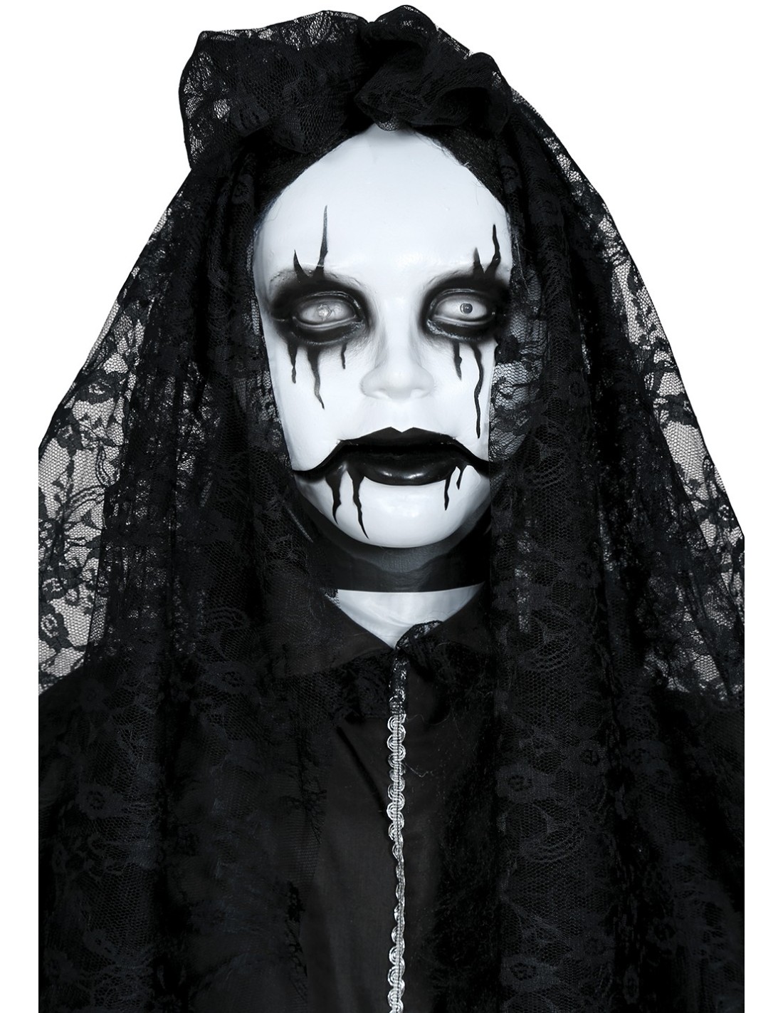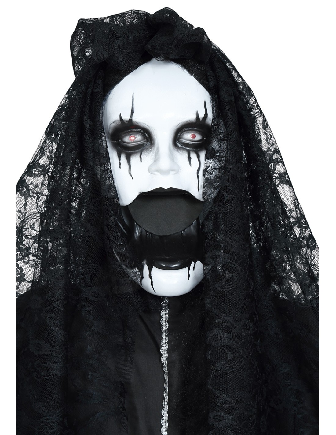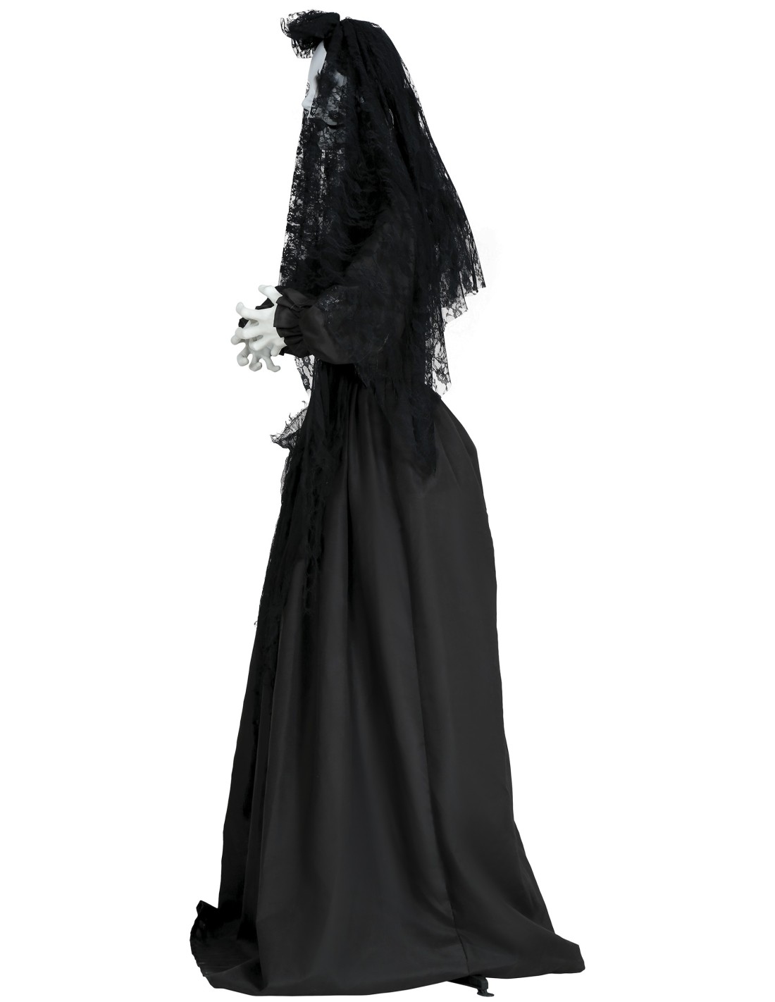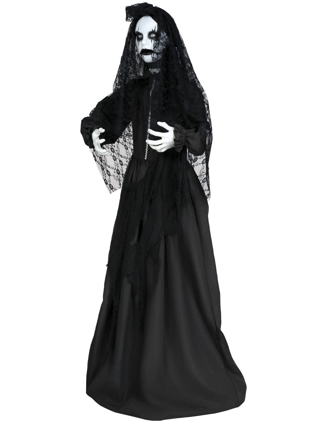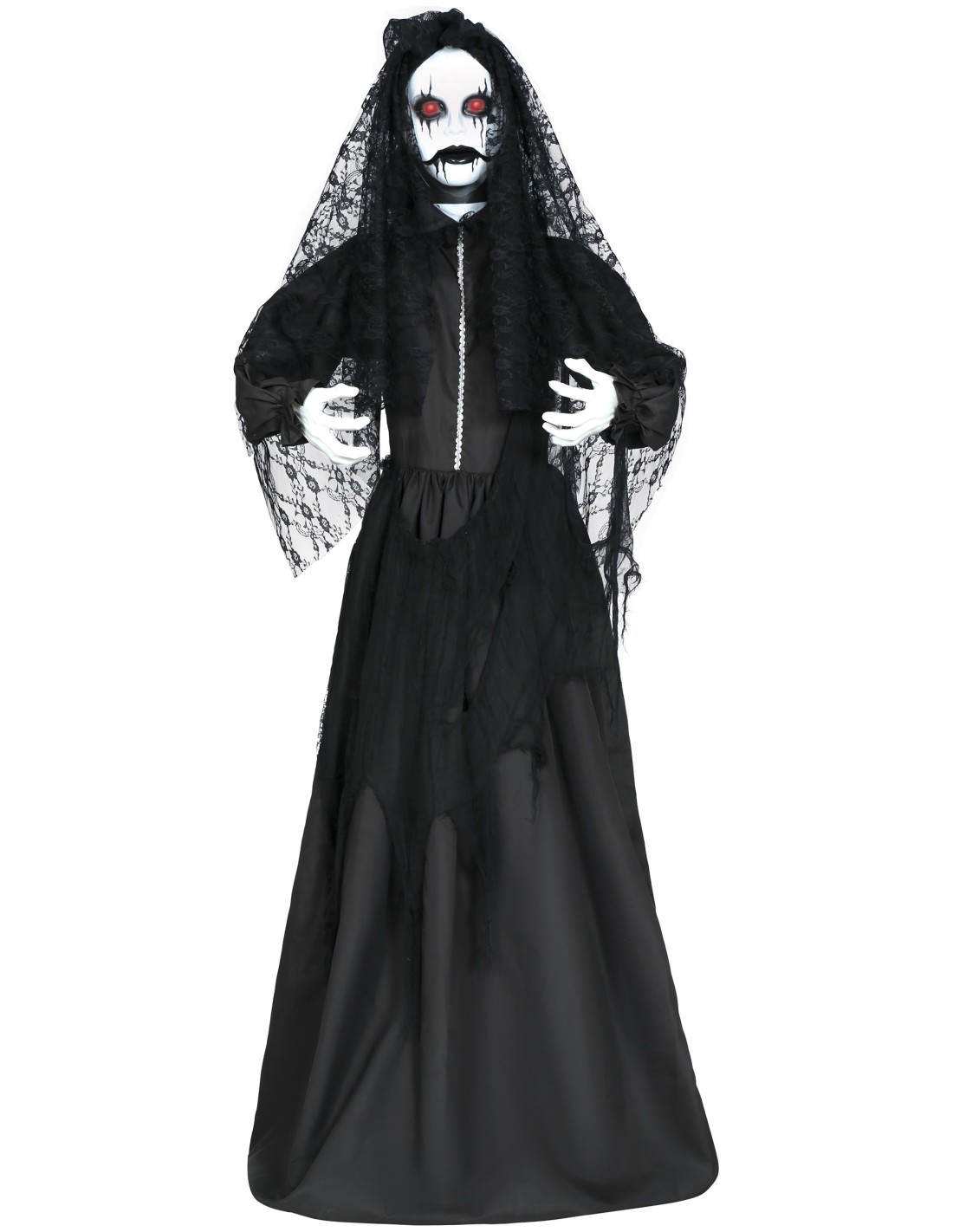 La Governante Parlante è una decorazione horror animatronica che trasforma qualsiasi ambiente in una scena da brivido. Questa figura spettrale indossa un lungo abito nero logoro con velo funebre, maschera cadaverica dai tratti inquietanti e lunghi capelli neri scompigliati. Il sistema elettronico integrato produce effetti luminosi, sonori e movimenti automatici per spaventare gli ospiti. La struttura robusta garantisce stabilità durante l'attivazione degli effetti speciali.