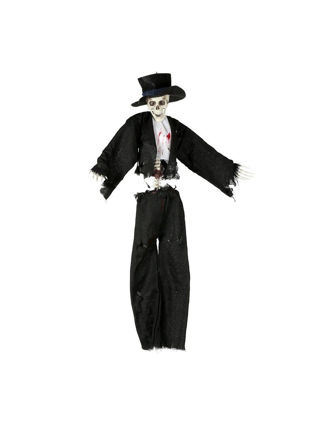 Questo sposo scheletro da appendere rappresenta una decorazione macabra perfetta per creare un'atmosfera sinistra durante le festività di Halloween. Il personaggio è vestito con un elegante abito nero da sposo completo di giacca, pantaloni e camicia bianca, mentre il teschio bianco conferisce un aspetto spettrale e inquietante. La decorazione è progettata per essere sospesa, creando un effetto scenografico di grande impatto visivo che non passerà inosservato agli ospiti.
