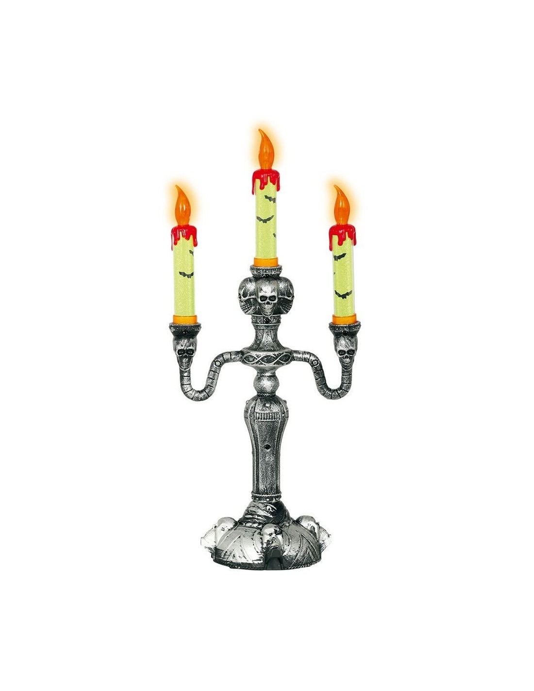 Questo candelabro argentato con tre candele create un'atmosfera misteriosa e spettrale perfetta per le tue decorazioni a tema horror. L'elegante base decorativa sostiene tre bracci che reggono altrettante candele verdi con fiamme animate, creando un effetto scenografico davvero suggestivo. Il design gotico e i dettagli elaborati lo rendono un elemento decorativo di grande impatto per trasformare qualsiasi ambiente in una scenografia da brivido.