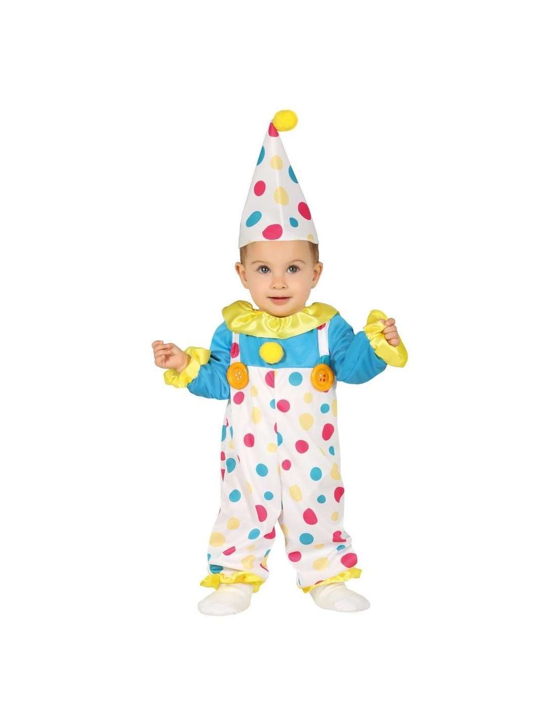 Questo delizioso costume da pagliaccio trasformerà il tuo bambino nel personaggio più allegro e colorato della festa. Il set completo include una tuta bianca decorata con vivaci pois multicolore, una camicetta azzurra con dettagli gialli sui polsini e colletto, e un cappellino a cono coordinato con pompon giallo. La tuta presenta comode spalline regolabili e chiusura pratica per facilitare l'indossamento. I colori vivaci - azzurro, giallo, rosso e blu - creano un look festoso perfetto per far sorridere grandi e piccini.
