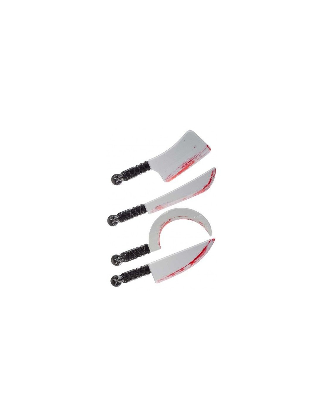 Questo set comprende quattro impressionanti coltelli insanguinati di circa 35 cm ciascuno, perfetti per completare qualsiasi travestimento horror. Il set include diverse tipologie di armi bianche finte: una mannaia da macellaio, un coltello ricurvo, una falce e un pugnale, tutti caratterizzati da lame argentate con effetto sangue rosso e impugnature nere avvolte. Ogni pezzo presenta dettagli realistici che rendono l'effetto scenico particolarmente convincente per i tuoi travestimenti più spaventosi.