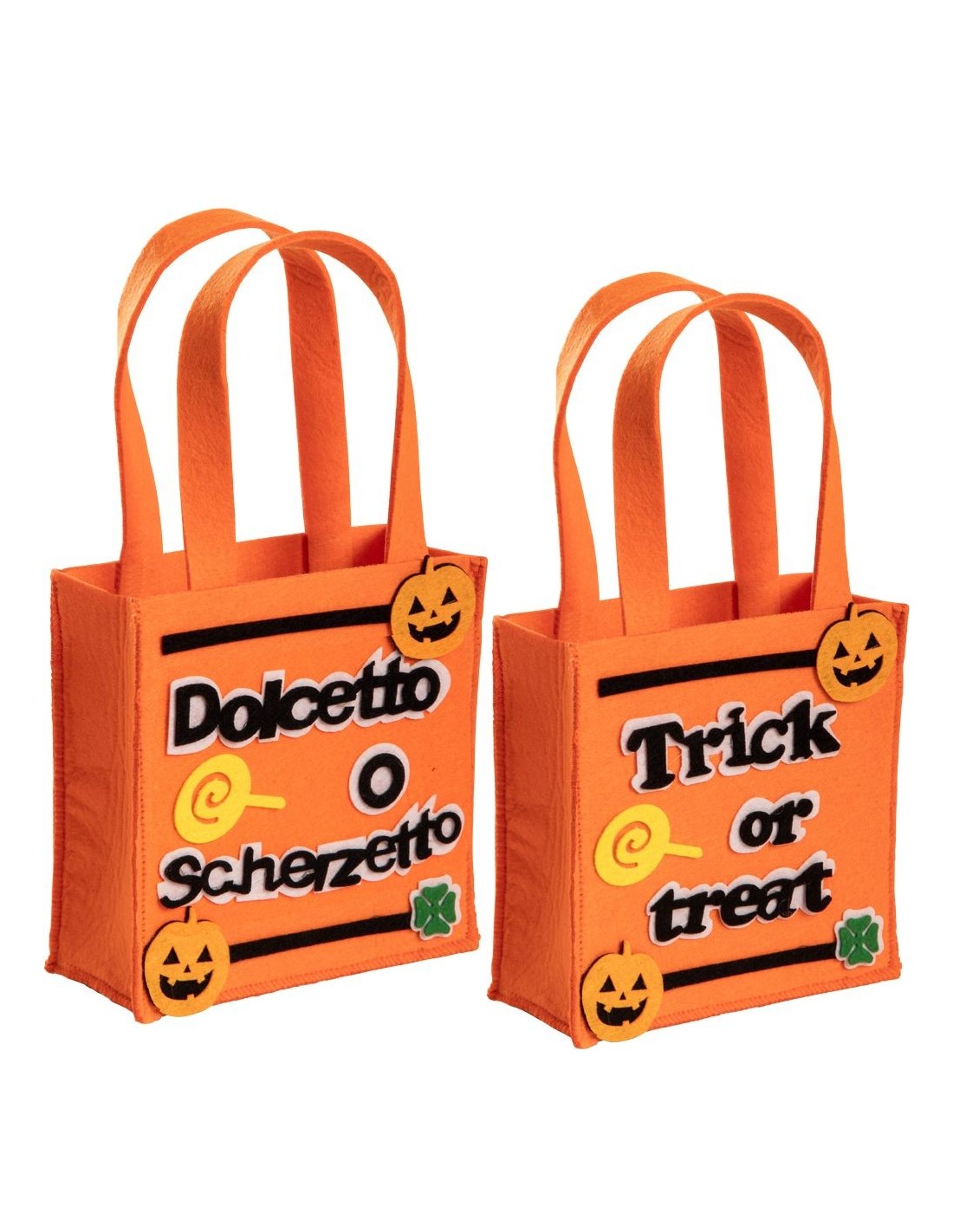 Simpatica borsina per Halloween in tessuto arancione con manici resistenti, perfetta per raccogliere dolci e caramelle durante il trick or treat. Decorata con allegre scritte 'Dolcetto o Scherzetto' e 'Trick or Treat' accompagnate da zucche sorridenti, misura circa 16x16 cm ed è ideale per bambini e adulti. La borsa presenta un design festoso con colori tipici di Halloween e grafiche accattivanti che la rendono un accessorio indispensabile per la notte più spaventosa dell'anno.