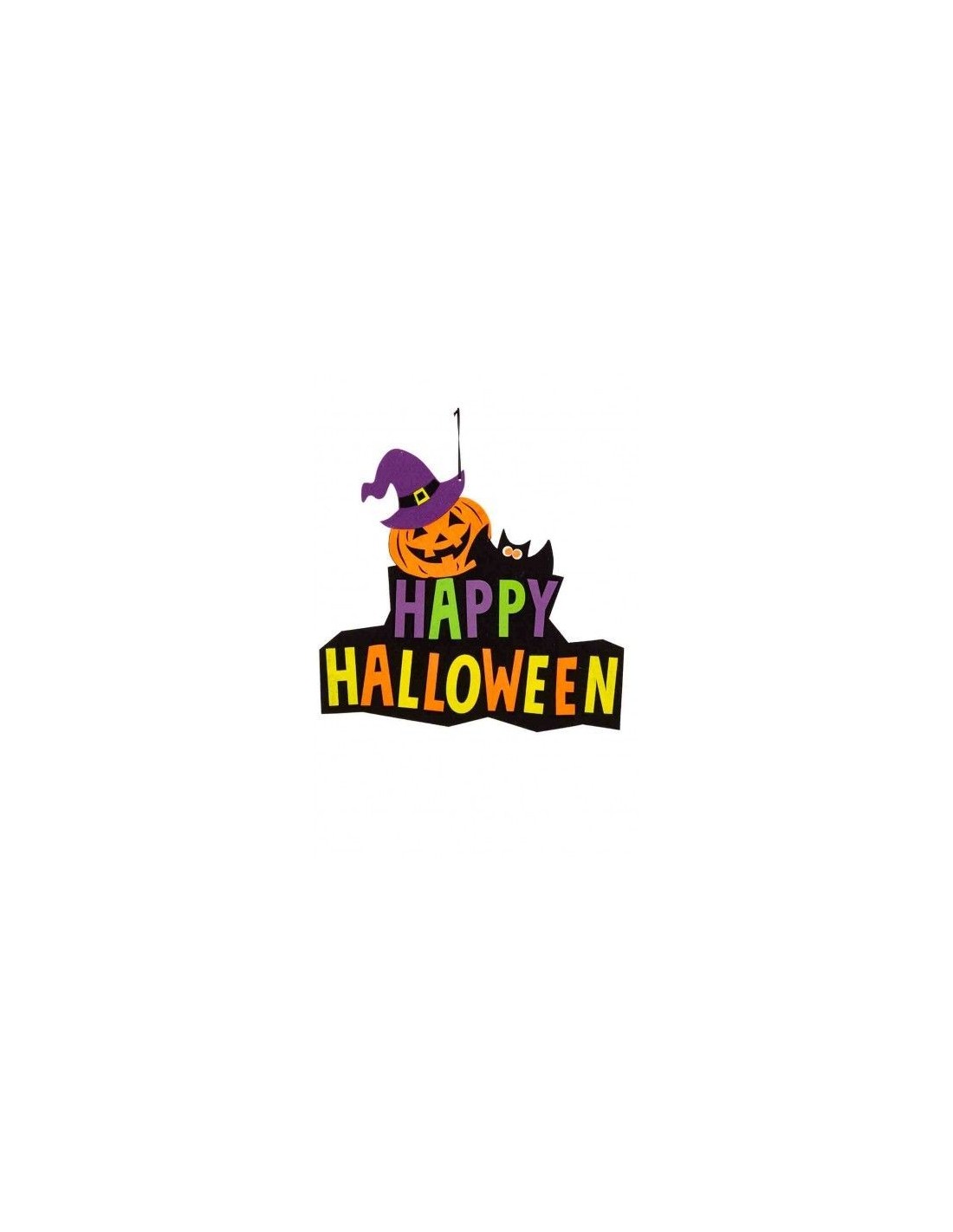 Questa allegra decorazione Halloween in feltro porta subito l'atmosfera della festa più spaventosa dell'anno nella tua casa. Con un'altezza di circa 36 cm, presenta la scritta colorata "HAPPY HALLOWEEN" accompagnata da una simpatica zucca con cappello da strega viola e un piccolo gatto nero. Realizzata in morbido feltro, questa decorazione è perfetta per abbellire pareti, porte o mensole con un tocco festoso e colorato.