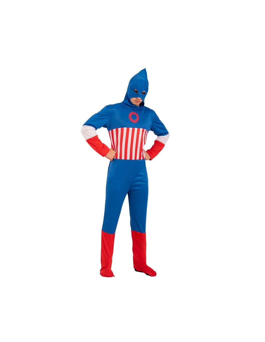 Trasformati nel supereroe americano più iconico con questo costume completo da Blue Man. Il set include tuta blu con dettagli rossi e bianchi, mantello coordinato, cintura a strisce e maschera caratteristica. Realizzato in tessuto morbido e confortevole, garantisce libertà di movimento durante feste e eventi. Il design fedele richiama il celebre personaggio a stelle e strisce, perfetto per chi vuole incarnare un vero difensore della giustizia.